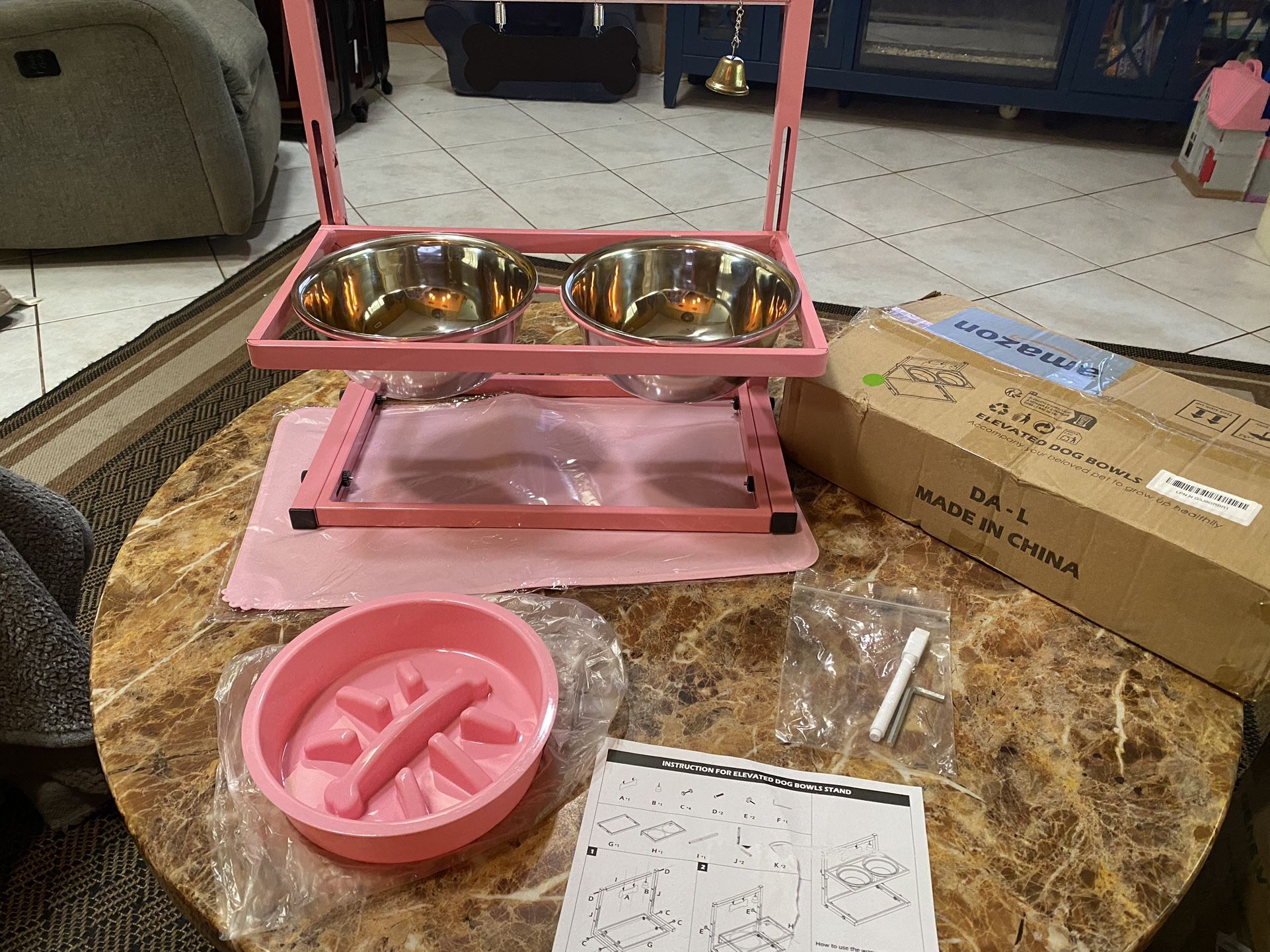 New Pink Elevated Dog Bowl Stand with Two 1700ml Stainless Steel Food Bowls, Slow Feeder Bowl Pick up Gatlin / PSL Blvd Just Assembled Including… 2 stainless steel food bowls 1 Slow feeder bowl 1 Spill Matt Pen for personalization Elevated Dog Bowls with Slow Feeder are designed to promote better digestion and reduce stress on your pet's joints and neck. The built-in slow feeder helps your dog eat at a slower pace, making it easier for them to digest their food and reducing the risk of bloating or other digestive issues. The raised dog bowl stand also encourages a more natural feeding position, making it easier for your pet to swallow their food. ADJUSTABLE HEIGHT FOR ALL DOG LIFE STAGES: The elevated dog bowl is thoughtfully designed to be easily adjustable from 4.5 to 12 inches, making it suitable for large, medium, and small dogs and cats. Accompany your pet from puppyhood to adulthood with hassle-free height adjustments, no tools required MINIMIZES NECK AND JOINT STRAIN: The raised dog bowl stand is designed to be adjustable to the perfect height for your pet, allowing easy access to food and water. It helps reduce bloating, neck, and joint stress during feedings, promoting healthy digestion for all four-legged friends, the dog bowls large sized dog is perfect for large dogs and older dogs DURABLE STURDY AND TIP-RESISTANT: The raised dog food bowls for large dogs is made of high-quality industrial-grade metal. It can withstand pet chewing and scratching. In addition, we have implemented an anti-tip function to prevent Naughty Dog from tipping over the dish rack; by adjusting the base, the dish rack becomes more stable PET INTERACTION:Dog bowl set features a special bell to call your pet, adding fun to meals. Personalize the name tag with the included white pen. The spill mat keeps floors clean