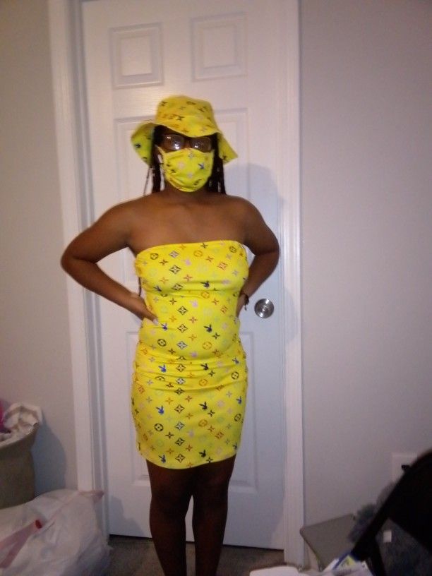 Dress,hat,and face mask playboy bunny design Comes in yellow,white, light blue,pink and purple