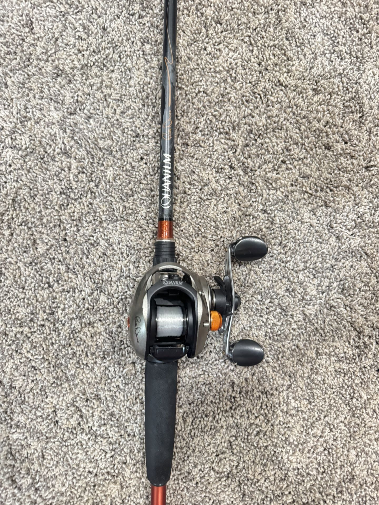 7ft Medium Heavy Silver and Orange Bill Dance Quantum Baitcaster Combo