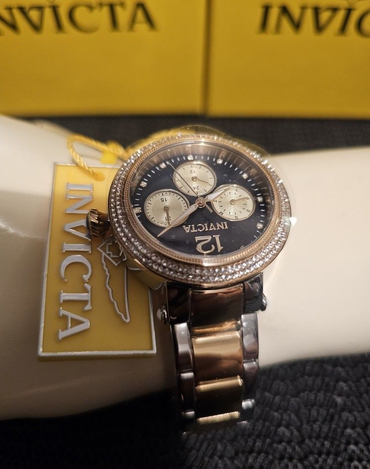 ((NEW LOW AND FINAL PRICE AT $100.)) NEW LADIE'S BEAUTIFUL GOLD & SILVER-TONE WATER RESISTANT 100% ORIGINAL INVICTA CHRONO WATCH. COMES WITH CASE TAGS AND NEW BATTERY, FOR ONLY $120. SERIOUS BUYERS ONLY, CHECK MY OTHER WATCHES THANK'S. /ABLO ESPAN̈OL ((NUEVO PRECIO REBAJADO Y FINAL A $100.)) TENGO ESTE RELOJ NUEVO MUY BONITO LUJOSO DE MUJER, COLOR ORO CON PLATIADO CONTRA EL AGUA 100% ORIGINAL MARCA INVICTA. BIENE CON SU ESTUCHE ETIQUETA Y PILA NUEVA POR SOLO $120. COMPRADORES SERIOS SOLAMENTE, MIREN MIS OTROS RELOJES GRACIAS.