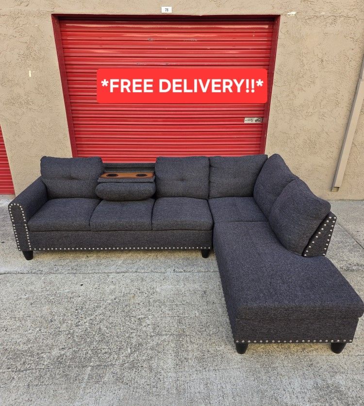 Gorgeous L Shaped Sectional Couch Elegant Design Studded Linings Cup Holders No Damage to Frame No Tears No Stains No Scratches Very Clean In Excellent Condition!! Measures 8ft x 5ft9in *Free Delivery Within 15 Mile Radius!* !!CASH/CREDIT CARD/DEBIT/ZELLE/VENMO ALL ACCEPTED!! !!Payment upon delivery or pick up!! *To see other sofas available just click my profile!