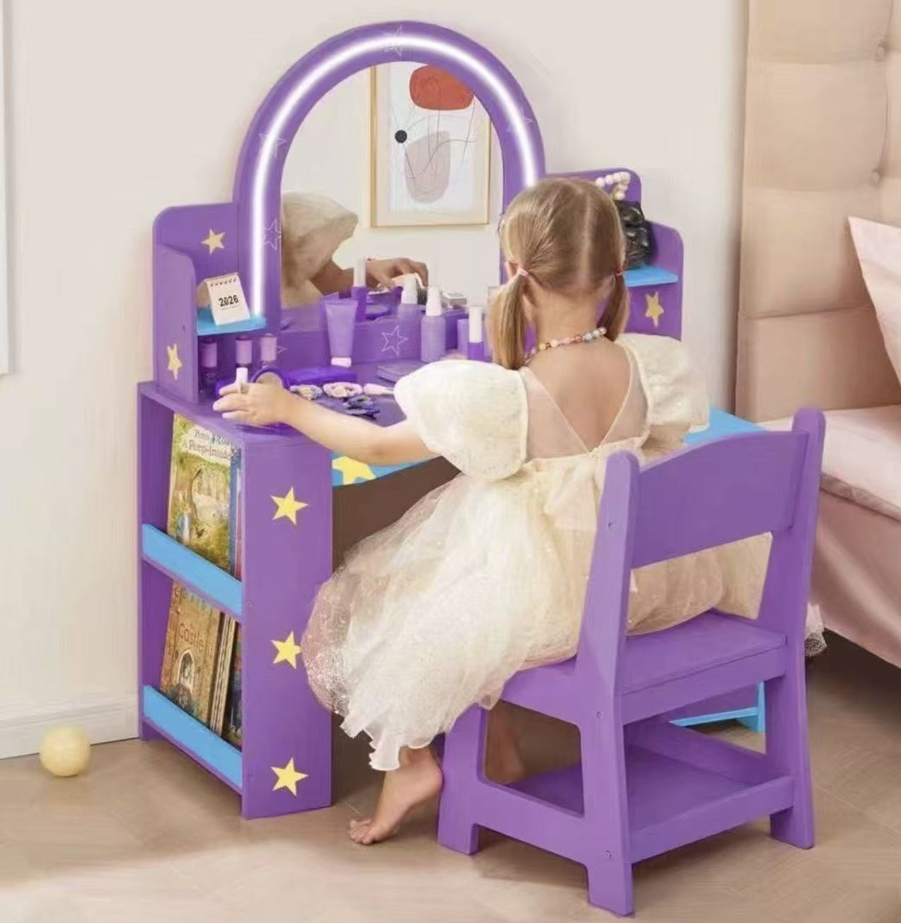Kids Vanity with Lighted Mirror, 2 in 1 Princess Vanity Set Toddler Vanity Table & Chair Set with Open Bookshelf, Storage Cabinet (Firm Price)