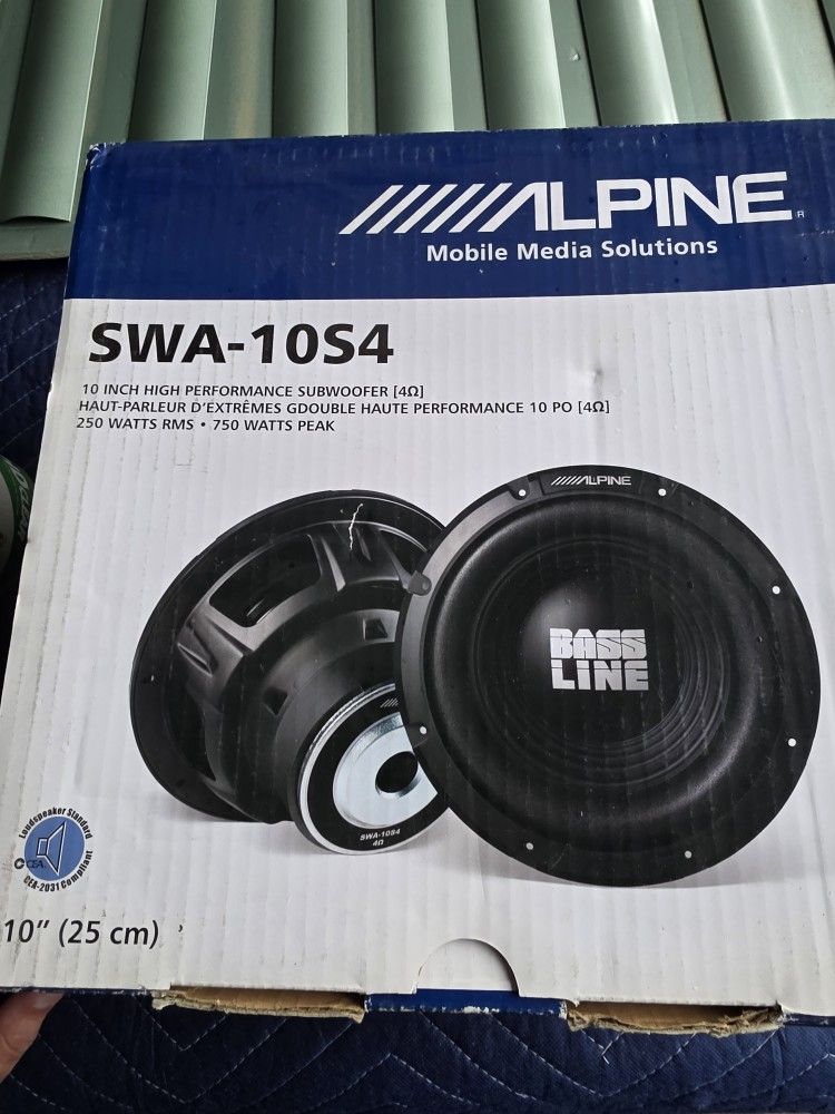 Selling 2 - Alpine SWA- 10S4 or trade for a equal value amplifier. 10" subwoofer with 4-ohm voice coil polypropylene and mica cone with poly-foam surround frequency response: 24-200 Hz power handling: 50-250 watts RMS peak power: 750 watts sensitivity: 86.5 dB top-mount depth: 5-5/16" sealed box volume: 0.65-1.0 cu. ft ported box volume: 1.0-1.75 cu. ft.