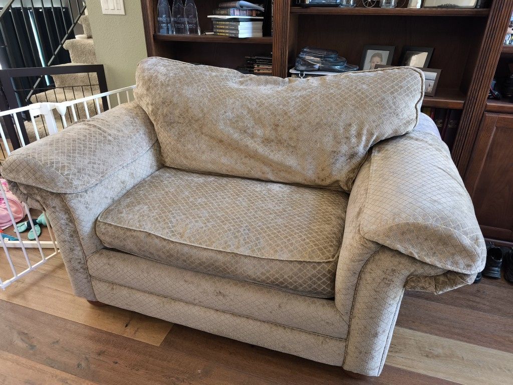 Pick up in Federal Way/Twin Lakes area. Must have transportation and 2 people to move this. Wood feet can be removed to fit through doorways. Purchased from Bassett. First to come pick it up, gets it. Dimensions: 58 in wide x 38 in deep x 32 in tall Full disclosure: our house has dogs, no smoking.