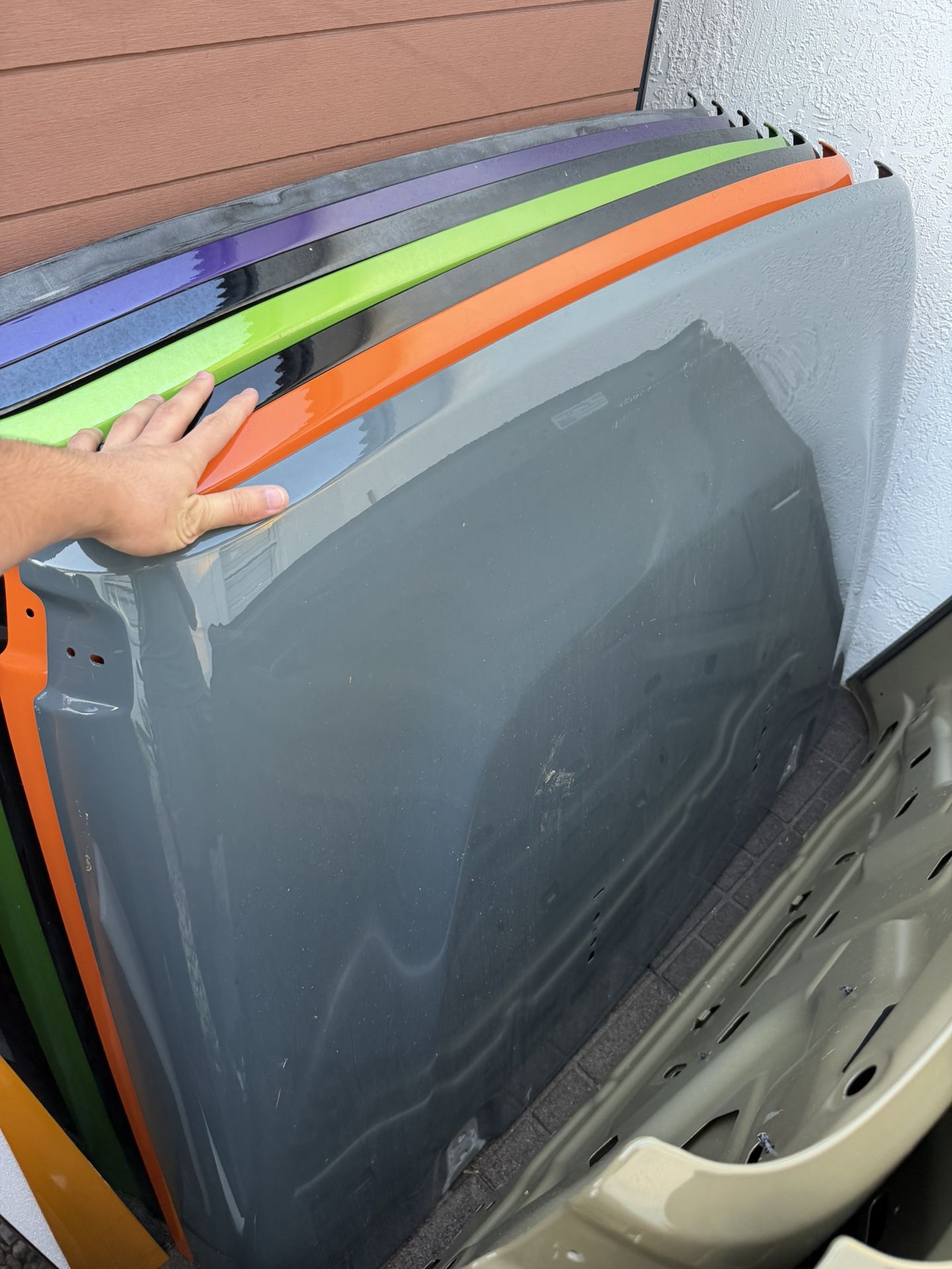 Jeep wrangler gladiator hood tan grey Check out my page for jeep wrangler gladiatior and ford bronco parts. Hood Bumper headlights taillights fenders quarter panels wheel flares running boards skid plates etc