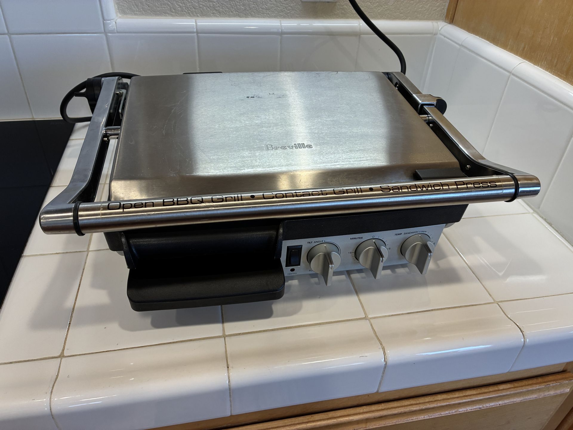This 1500W electric grill is in good condition and works fine. There is a small crack in the plastic on the bottom side of the grill, which might have come from heat/repeated use, but I tested it recently and it works fine. The cracked plastic panel can be replaced if you can find a replacement part. On the front panel, there is a power switch, tilt angle dial, timer, and temperature adjustment (350-450 degrees F). The grill can be used as a sandwich press, or fully opened. The grill area is about 15 inches by 23 inches when fully opened, and 15 inches by 11.5 inches when half opened. The grill also has a removable drip tray. Asking $40 OBO, no trades accepted. Pick up in Dublin, CA 94568.