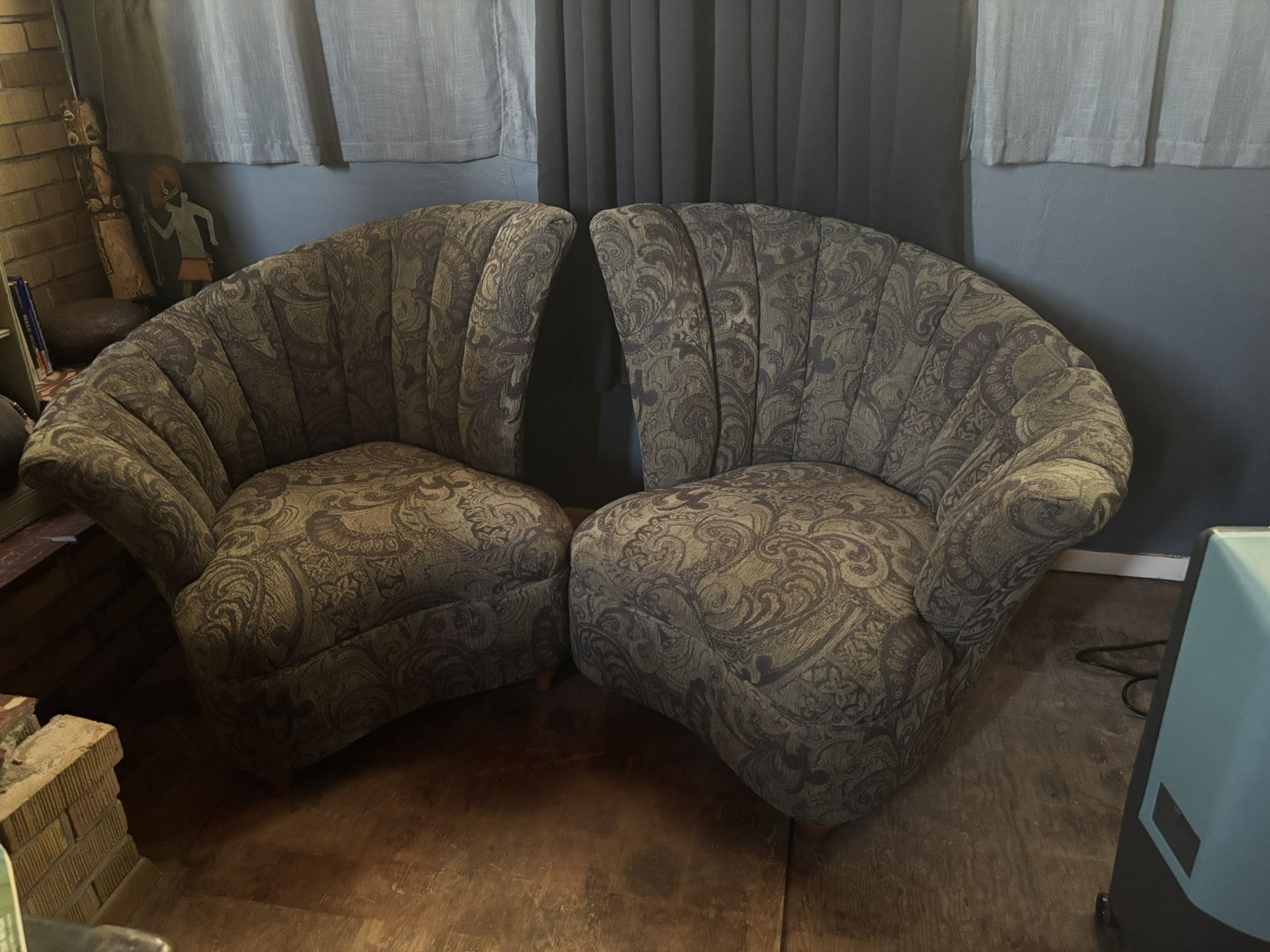 Pair of beautiful chairs. Print is lovely and muted. Colors are sage green and muted lavender. My living room is dark so colors do not show in pictures. Chairs were in guest bedrooms and rarely used. Excellent condition and very comfortable. PU near S. Central and W. Dobbins Rd.