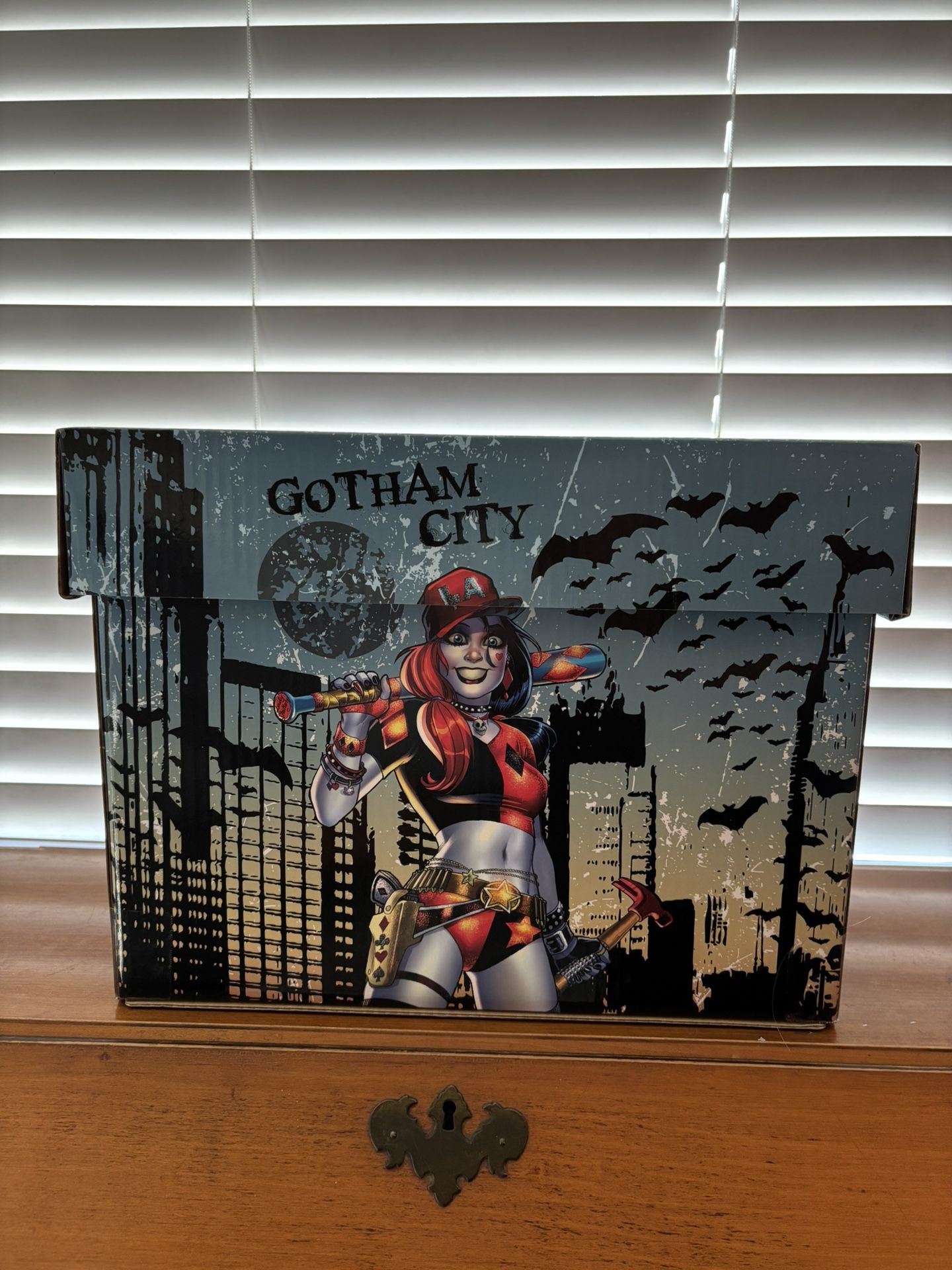 Collector Comic book storage box with Harley Quinn /Gotham City graphic. Great condition but with some tape on corner to fortify it.