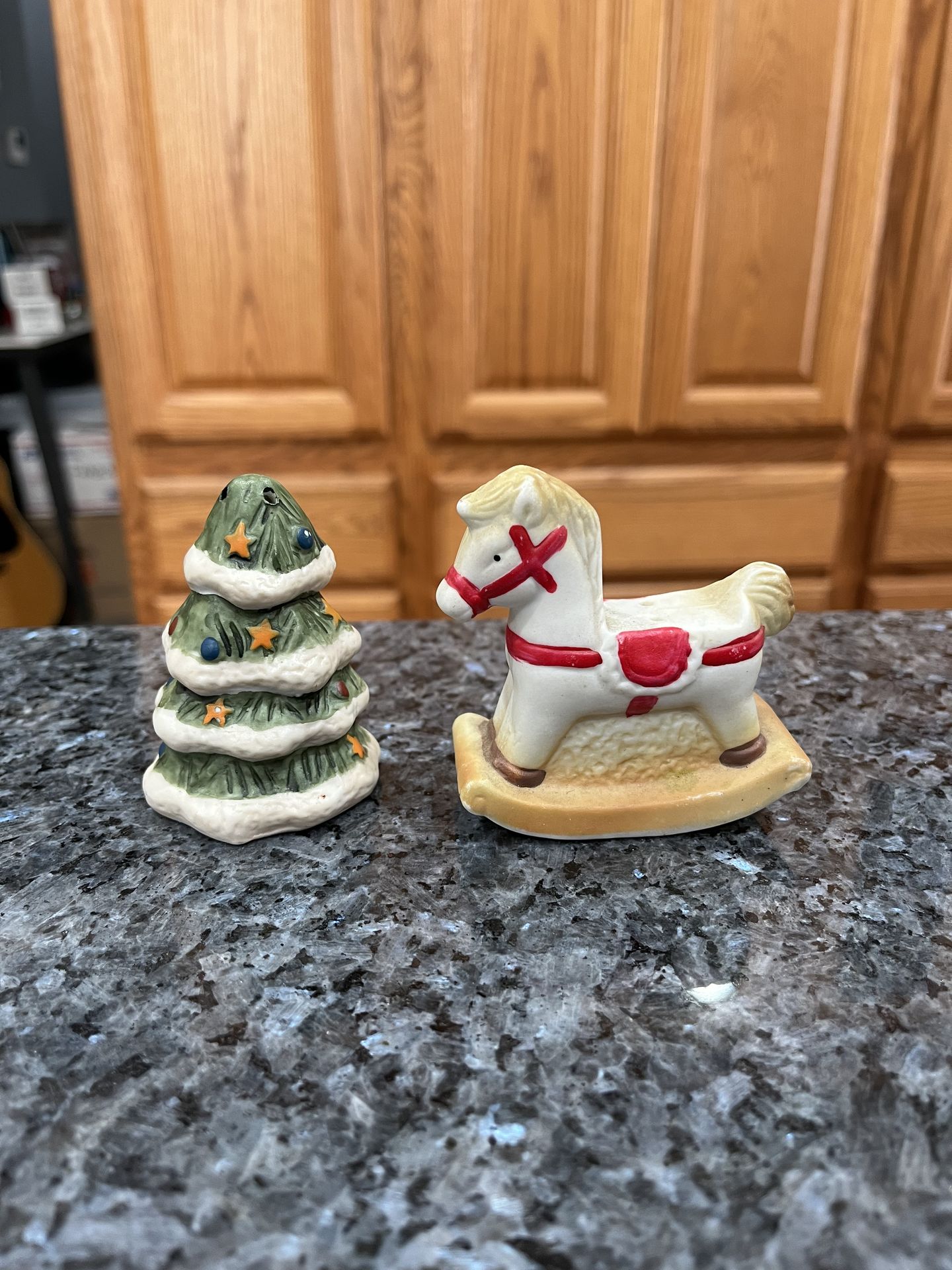Vintage Ceramic Christmas Tree and a Rocking Horse Pair of salt and pepper shakers. Size approximately 3 inches tall. Preowned never used. Has been on display in a cabinet with a very large salt and pepper shakers collection. Smoke free home