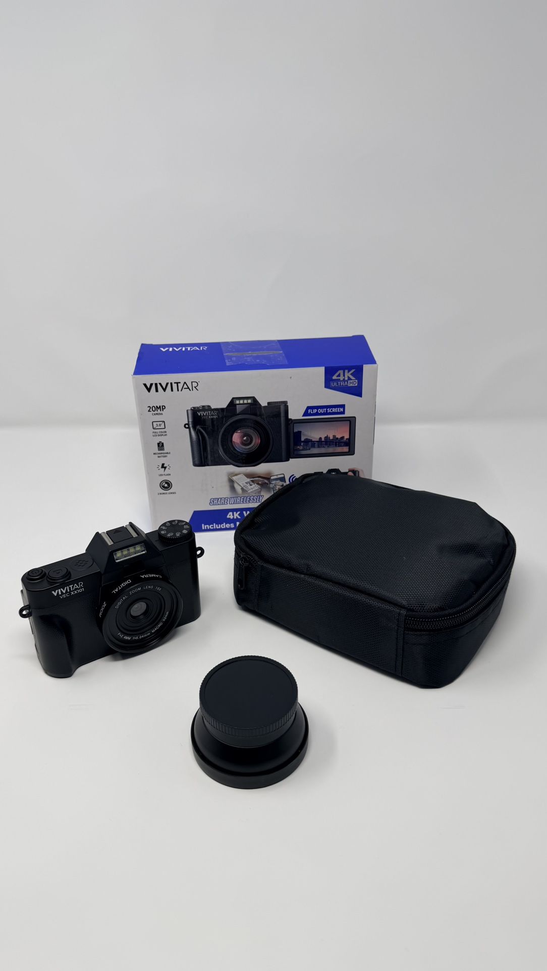 Open box. The Vivitar Vivicam VECXX101 Compact 20MP 4K Digital Camera in Black offers a sleek and portable design with a 4x optical zoom for capturing high-quality images and videos. The camera features a flip-out screen for easy viewing and a built-in flash for added versatility. With connectivity options such as USB and lithium-ion battery type, this compact camera from Vivitar is packed with features to make capturing memories convenient and efficient. Ideal for those looking for a reliable and user-friendly digital camera for everyday use. Retail starts at $99 Box includes: - Camera - 2 lenses that attach to each other - Carry bag - 32 GB memory card - Original package Picture of my dog so that you can verify the quality of the pictures.