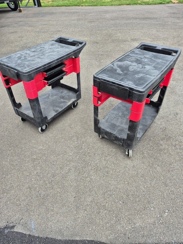 Selling 2 Rubbermaid service/tool carts. Great condition barely used inside only. Each has two drawers that slide through both sides. One has turning wheels in front the other in the back - but can easily be changed. Purchased for over $400 each but Amazon has them for $310 plus tax =@$340 Will sell each one (1) for $175 or both (2) for $325 cash. Can meet at Arlington grocery outlet parking lot at 3pm weekday most afternoons. Keywords: service cart, cart, plastic cart, shop cart, Rubbermaid, rolling cart, work cart, cart with drawers