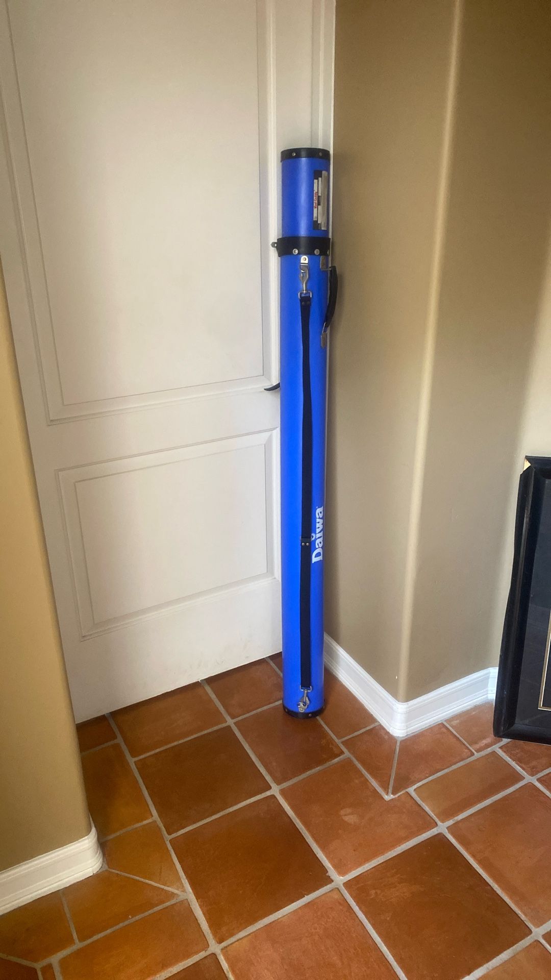 Hardshell standing 5 foot six extended out to 8 lfoot six crush shoulder strap, ID plate, 3 1/2 inches inside diameter great shape for protecting your fishing rods excellent shape
