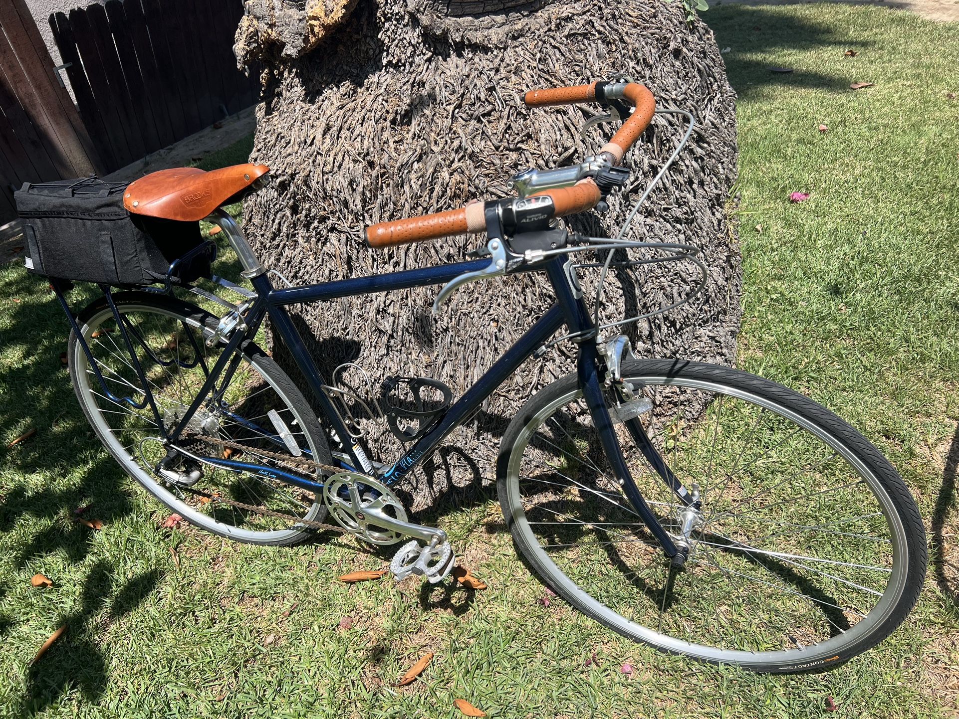 European-styled urban bike, commuter, excellent for errand runs. Equipped with upgraded parts: Brooks leather seat Brooks leather wrap in handle bar 2 water bottles Small cargo pack in rear rack Retro bell Front headlight Rear lights Oversized pedals for comfortable riding Perfect urban bike or for beach cruising.