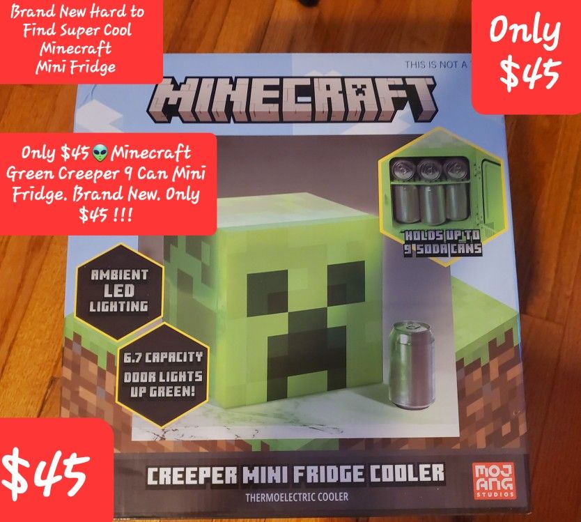 ONLY $45 !!! 🎅Great Holiday Gift Idea🎅 👽SUPER COOL MINECRAFT MINI FRIDGE👽 Minecraft Green Creeper 9 Can Mini Fridge 6.7L 1 Door Ambient Lighting BRAND NEW NEVER OPENED ONLY $45 !!! 👽BRAND NEW MINECRAFT GREEN CREEPER SQUARE MINI FRIDGE GREAT GIFT IDEA👽 (Sells for $80) You're thirsty, but you don't want to walk away from your game to go get a chilled beverage. This Minecraft Creeper Mini Fridge Cooler to the rescue! (Who ever thought you'd be rescued by a creeper?!) Stick this portable refrigerator in your gaming space, and the only sound you'll hear will be when you pop open a cold soda. This compact cooler keeps your gaming fuel (drinks and snacks) close at hand. And you can even take it on the road with you, since it comes with a DC power adapter for your vehicle. Whether you stick it in your dorm, your gaming space, or your workplace as a little reward for when you have to be in the office, this Minecraft creeper will ensure you can work or play uninterrupted and refreshed. Official Minecraft Merchandise featuring the iconic Creeper design. Compact Capacity: holds 9 (12oz) cans. Portable Dimensions: 10.4 in (H) x 10 in (W) x 10 in (D). Efficient Cooling: Cools items up to 36°F (20°C) Versatile Power: AC/DC voltage BRAND NEW. Price Firm. Pick up North Plainfield by 127th and Ridge rd. (Sells for $80)