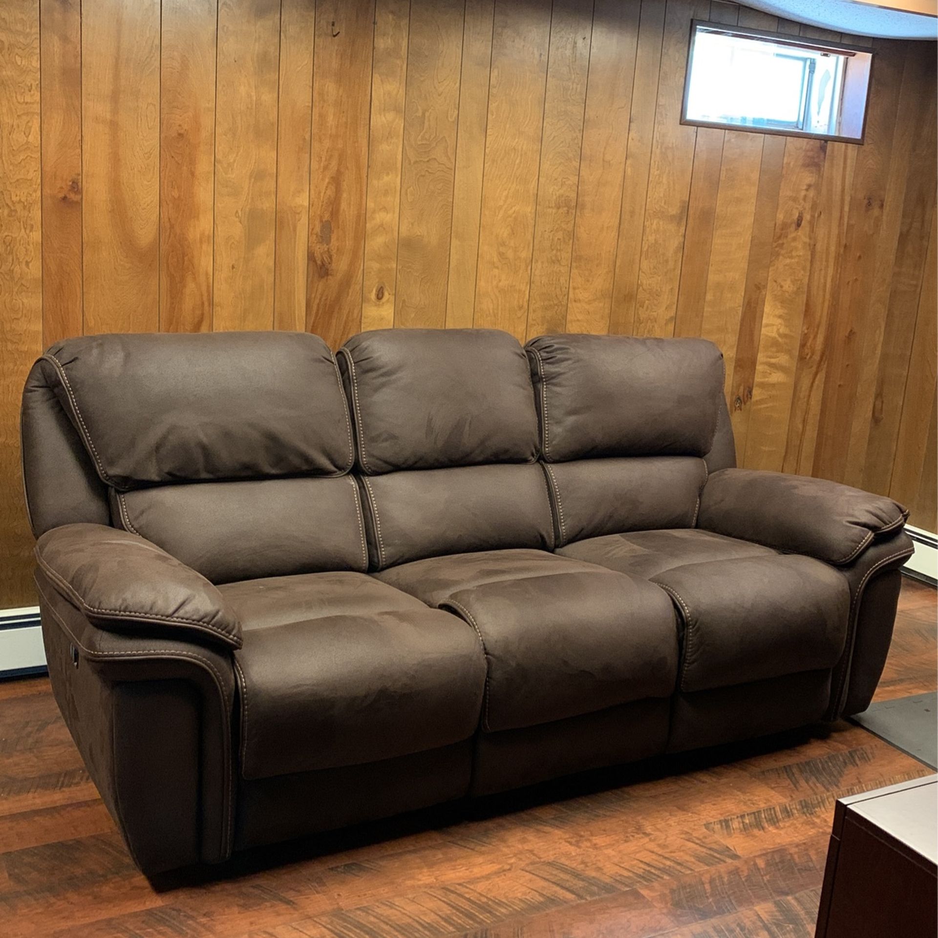 All cloth dark brown double reclining couch excellent condition Only 2 years old