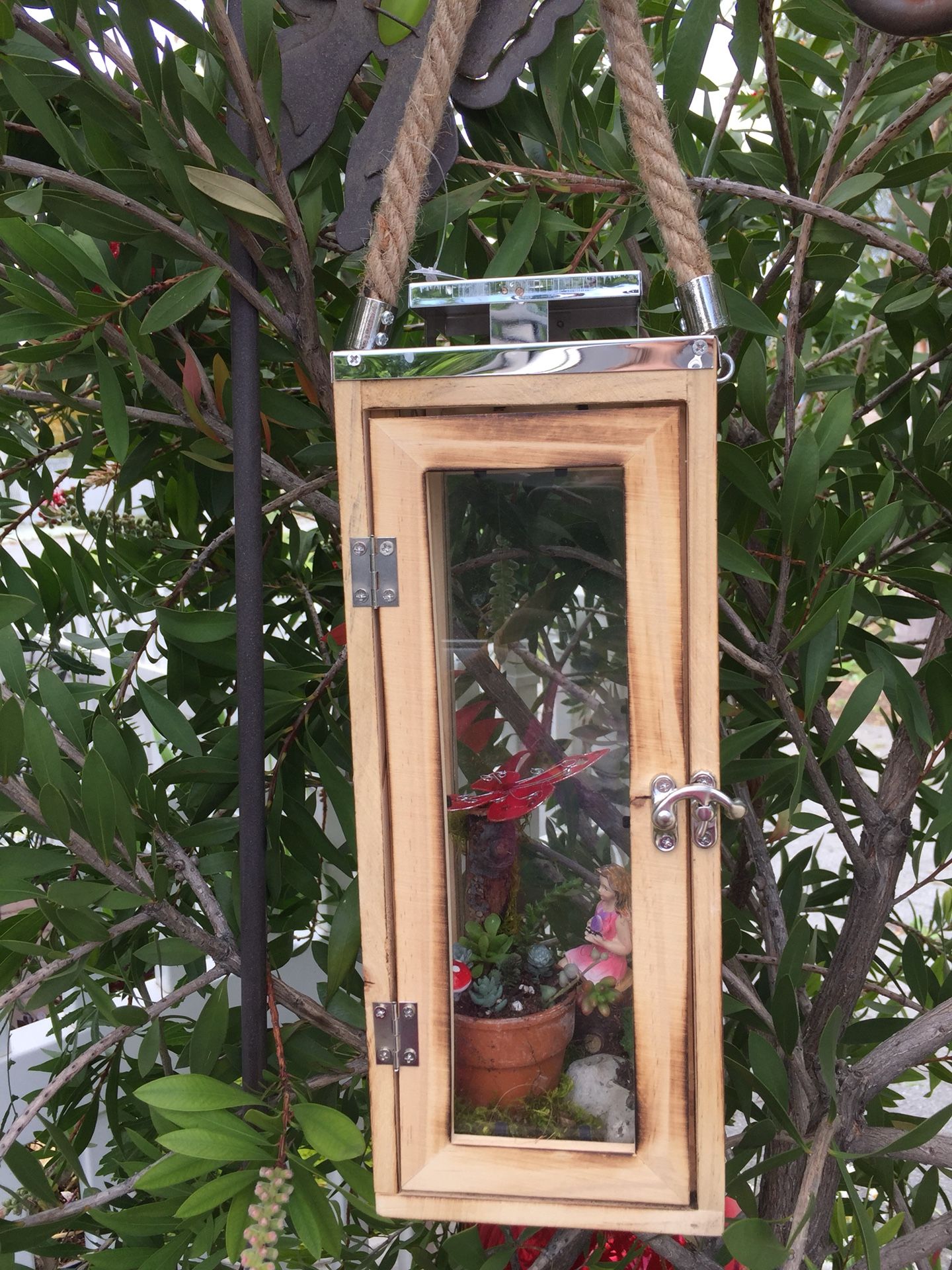 Large wood and glass candle holder with succulent plants and ferry garden