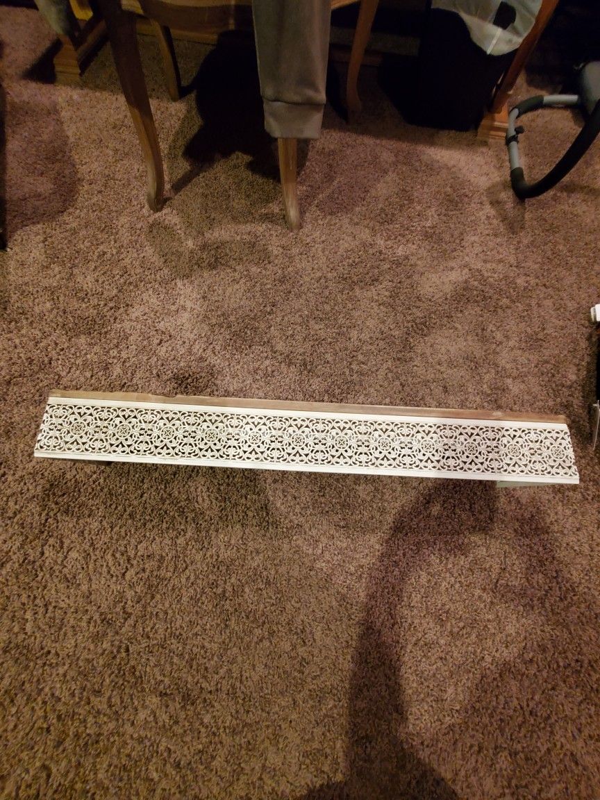 Farm House Shelf Never used. Metal filigree design with wood top. Antique white- beige 30 inches long 4 inches tall 8 inches deep