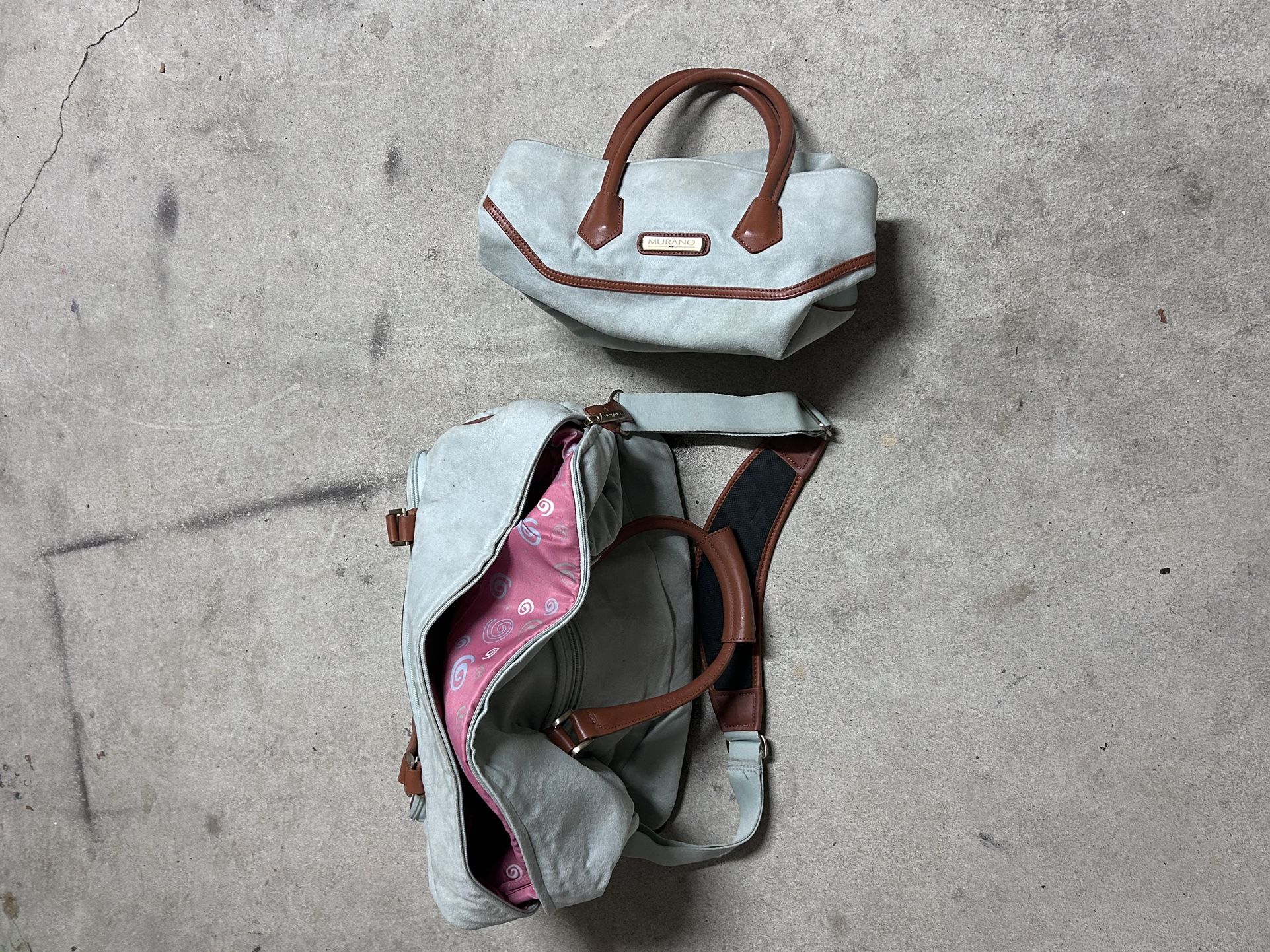 Gently used Murano bag set, includes a stylish duffle bag and a matching handbag. Both bags feature a soft light gray exterior with brown handles and trim, plus a fun pink patterned interior. Perfect for travel, work, or everyday use. Clean and in great condition! **Pickup only, Message if interested or for more details.**