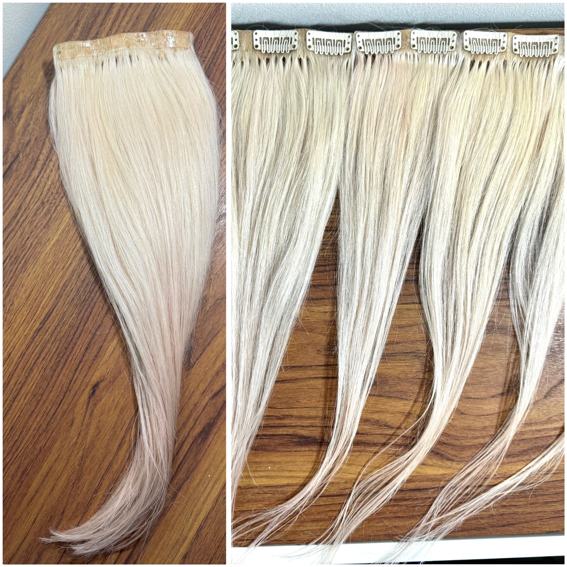 Custom made seamless hair clip in extensions made with professional single sided permanent hair wefting tape and liquid gold bond a weave for security. Perfect for fine hair. 82 grams worth of Brazilian human hair.
