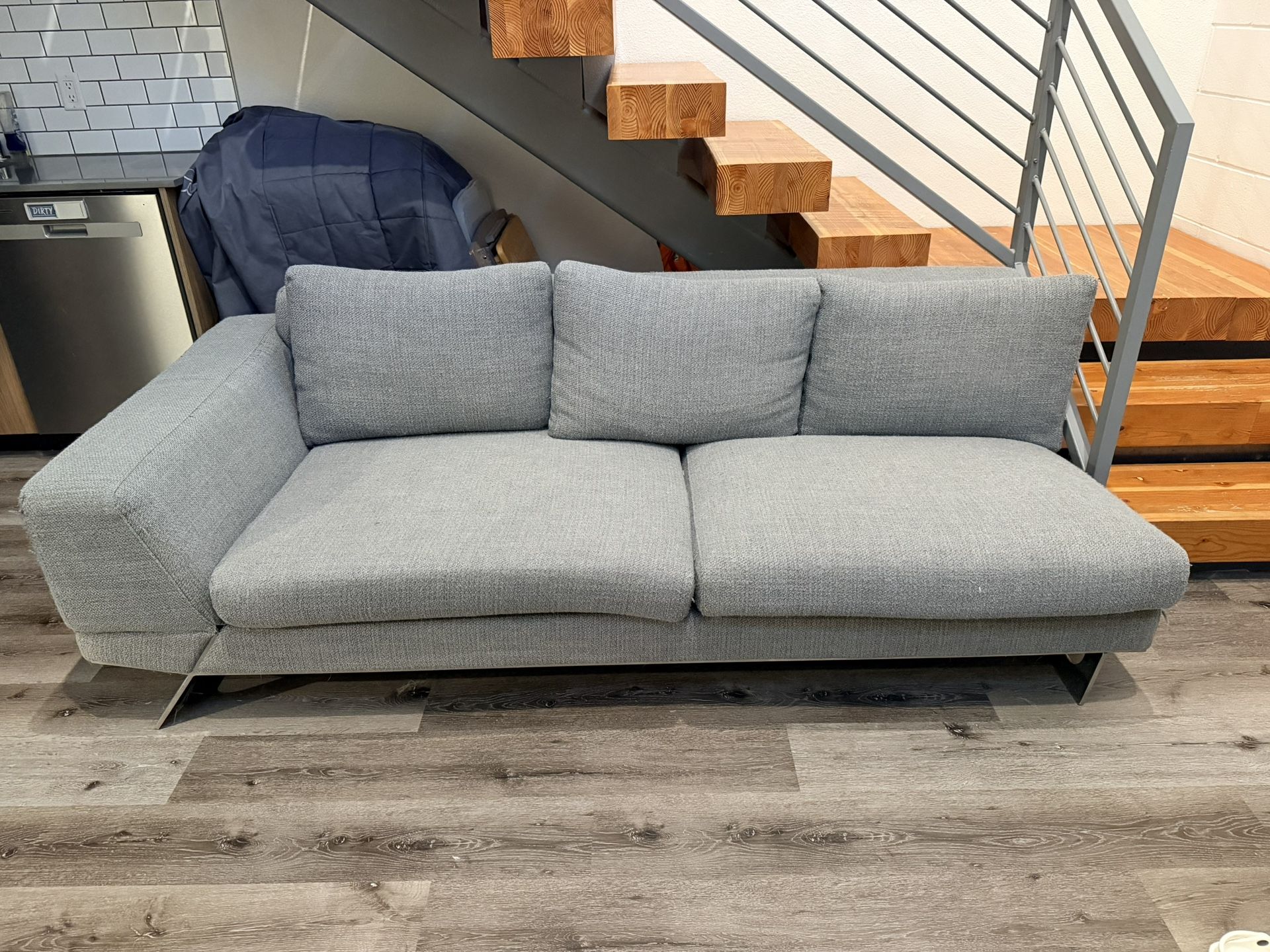Modern gray sofa in great condition. Comfortable, sturdy, and clean with a textured fabric and solid metal base. Fits well in a living room, apartment, or loft space. Just normal light wear. Dimensions: approx 7 ft wide. Price: $200 OBO Pickup only. No delivery.