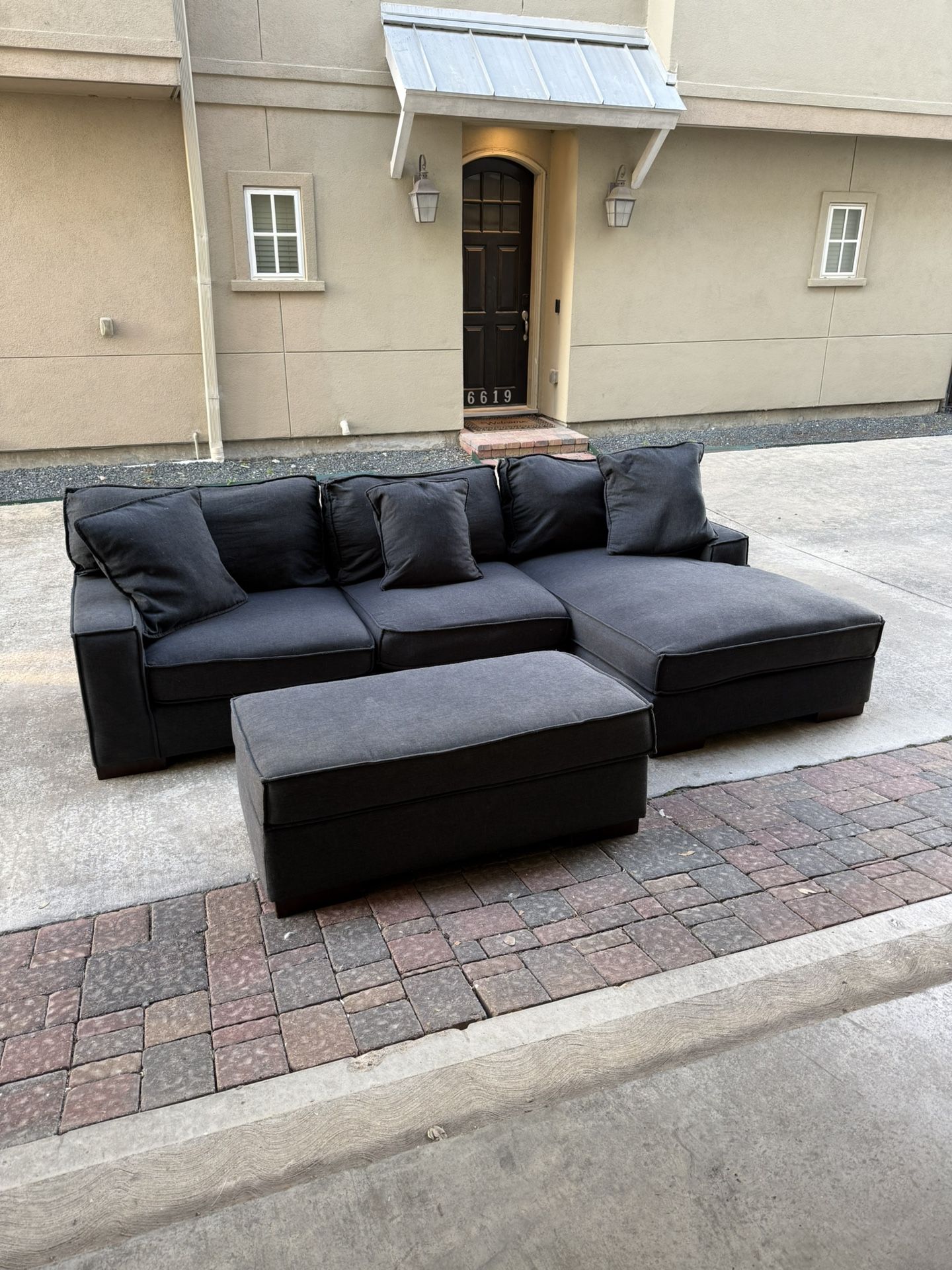 Navy blue sectional couch. Includes ottoman that opens up with storage space and 3 pillows. Measurements: Sectional: 120” x 65” (at widest points) Ottoman: 48” x 28” Couch comes from pet friendly household. I vacuumed, deep cleaned the couch frame, and washed all the cushion and pillow covers. But there are still some dog hairs remaining. There are however, no rips, tears, or scratches in the fabric. Zelle or cash payments only. No delivery, only pickup in person. Sectional comes apart into two pieces, but you will still likely need a pickup truck or trailer to haul it in one trip.