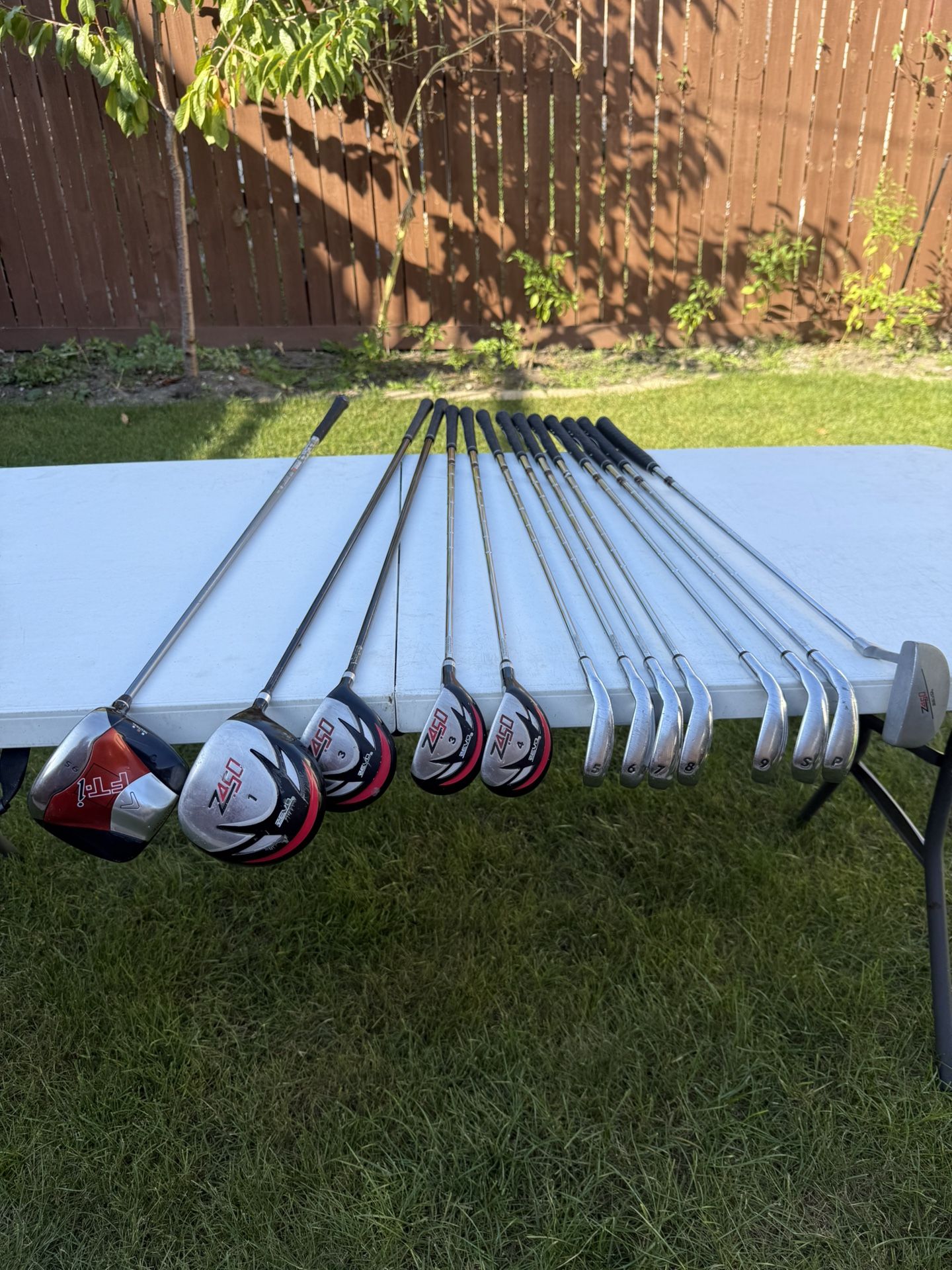Men’s right hand ZEVO 12-PIECE MEN'S COMPLETE golf set. Perfect started set. Includes everything in the picture including FT-i Callaway driver, vintage putter, vintage golf ball retriever, and all golf club covers shown.