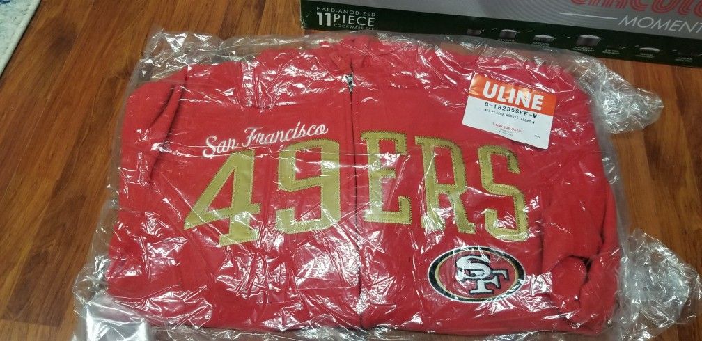49ers Fleece hoodie with front pocket and zipper. Embroidered team logos