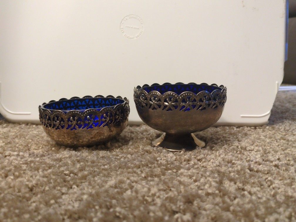 These are vintage Celtic Quality Plate sugar bowls with cobalt blue glass inserts, made in England. They are perfect for adding a touch of retro elegance to your home. These bowls can be used for serving sugar, candy, or as decorative pieces. The intricate silver-plated design and the vibrant blue glass create a beautiful contrast. Consider adding these to your collection or gifting them to someone who appreciates vintage items.