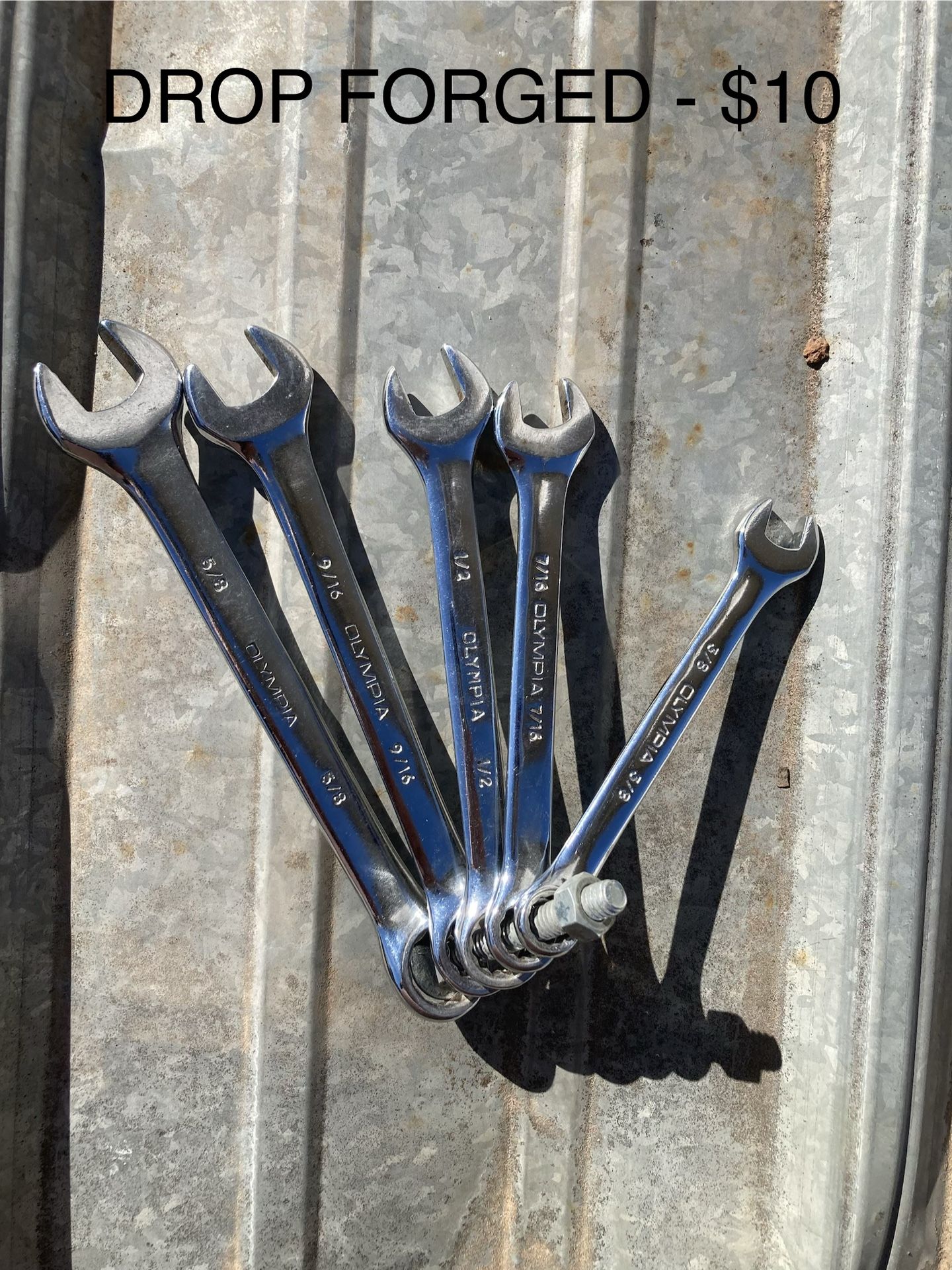 In this lot I have sixteen items of pliers, wrenches: 1) Five piece DROP FORGED new combination drop forged steel wrench set sizes 3/8", 7/16", 1/2", 5/8", 9/16"——-$10 2) groove joint 12 inch pliers with yellow handle, used but great condition——$10 3) linesman pliers 9 1/2 inches, used but great condition——-$10 4) OLYMPIA brand 3/4 inch combination wrench, new——-$5 5) CRAFTSMAN brand 3/4 inch combination wrench, new——-$10 6) THORSEN brand 5/8 inch combination wrench, new——$6 7) linesman pliers 7 1/4 inches, used but great condition——$8 8) DROP FORGED 6 inch combination wrench, mint condition—-$7 9) KOBALT brand seven piece combination wrench set 3/8", 7/16", 1/2", 9/16", 5/8", 11/16", 3/4", new——$20 10) groove joint pliers 7 inches, used great condition——$6 11) combination wrench 6 inch forged alloy steel mint condition——$7 12) slip joint pliers 6 inches, drop forged steel, new—-$5 13) combination wrench 6 inches, drop forged steel, new—-—$7 14) chrome vanadium 6 piece combination wrench set, new, 3/8", 7/16", 1/2", 9/16", 5/8", 11/16"——-$20 15) Two combination wrenches 200 mm, chromium molybdenum, mint condition ——-each $10 Any questions please ask. $10 MINIMUM purchase please. Prices not negotiable unless you want more than one item. Willing to ship also.