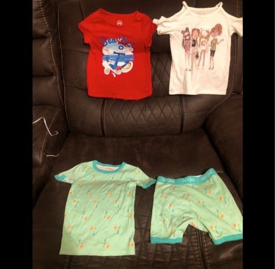 Like new. White shirt is a size 5/6 with the shoulders out. Red shirt is a size 6 with the shoulders out. Green outfit is a size 6.