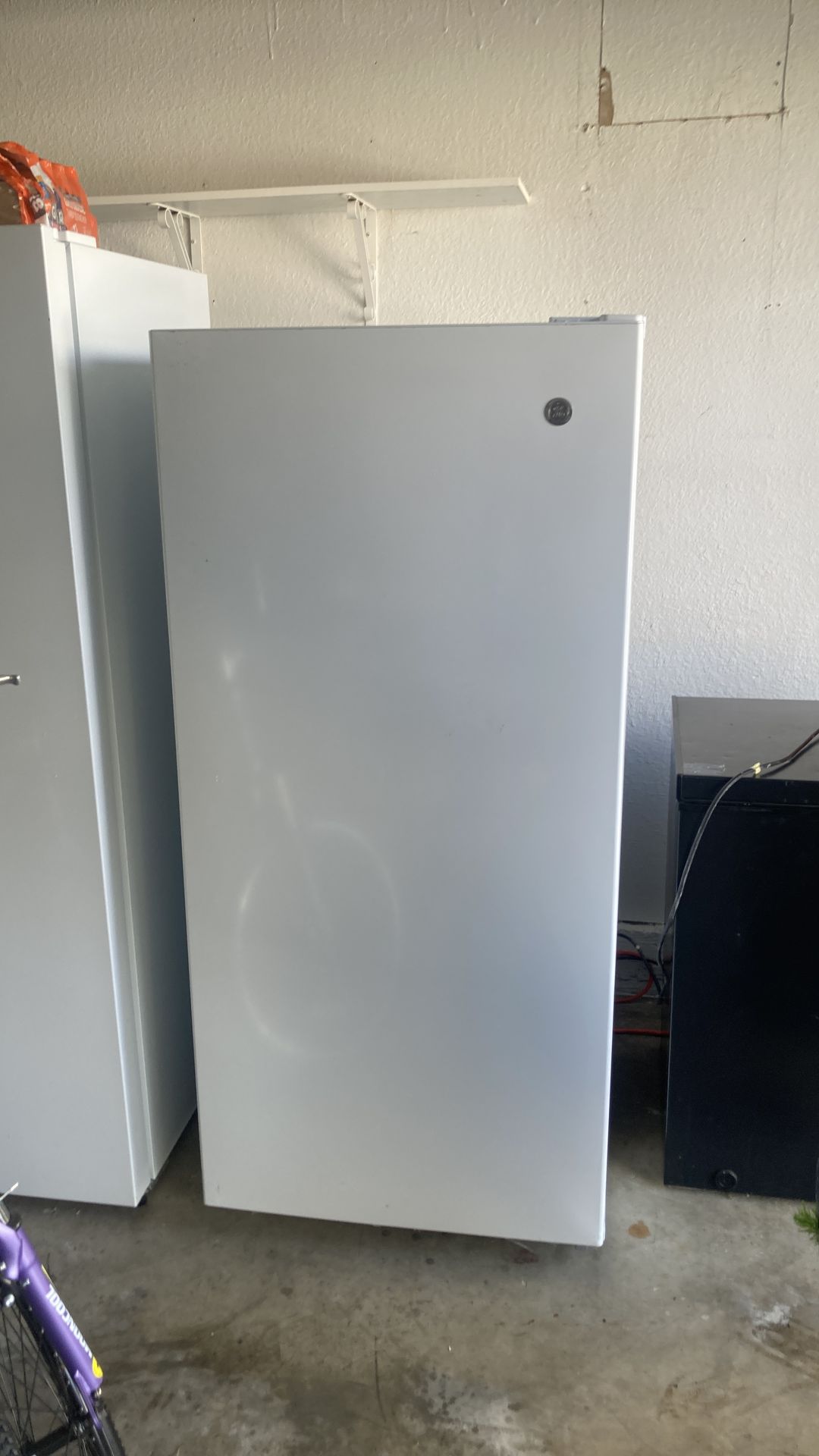 Stand up white GE deep freezer, works great but door needs to be adjusted to avoid air into freezer which causes moisture.