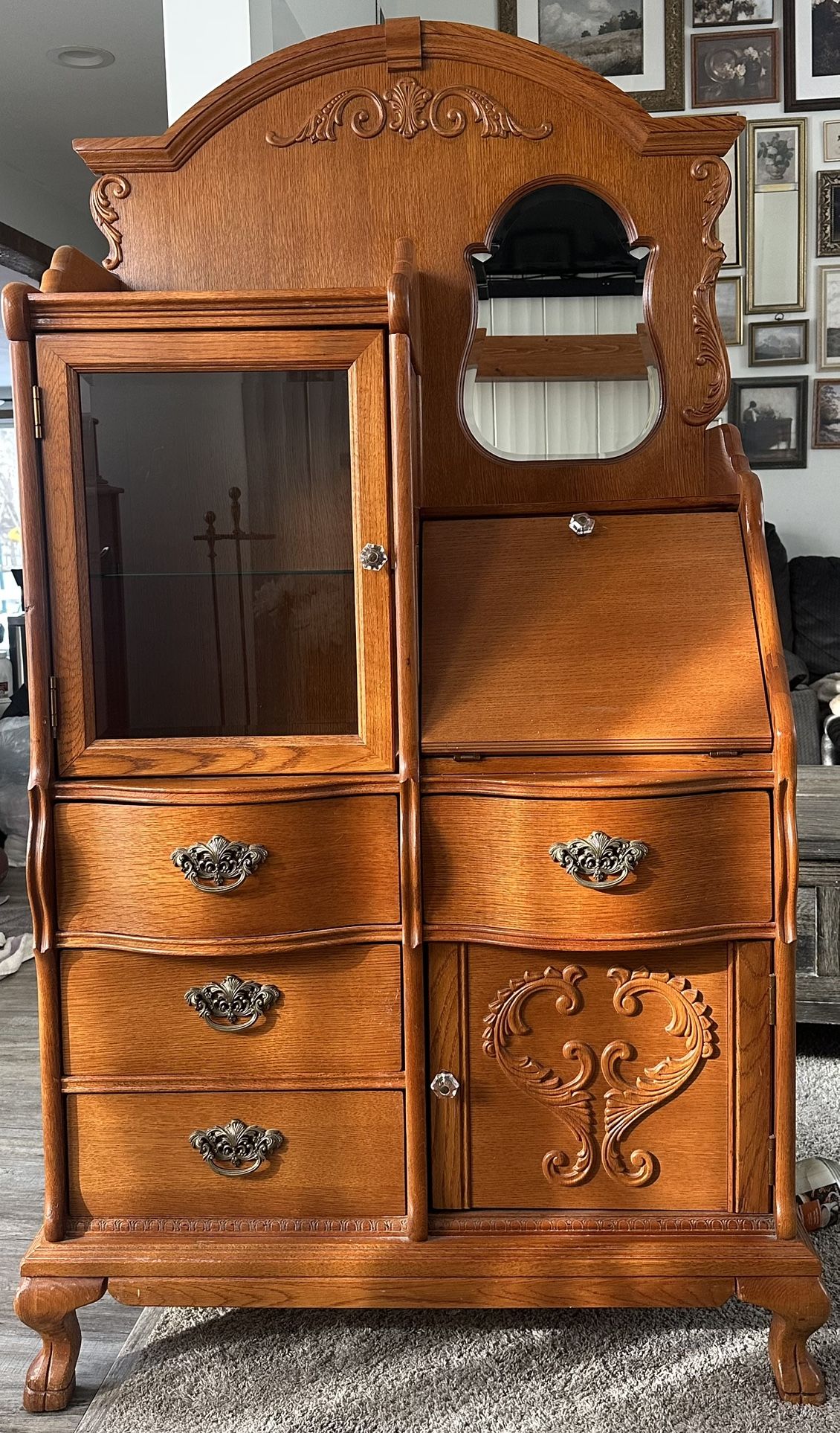 The Lexington Furniture Victorian Sampler Collection is a stunning secretary desk made of wood, brass, and glass. With a Victorian style and antique theme, this desk features intricate carvings, a mirror, and multiple drawers for hidden storage. The swing door mechanism and brass handle add to the vintage charm of this piece, manufactured in the United States during the late 20th century. Measuring 68" in height, 21" in length, and 37.5" in width, this secretary desk is both functional and stylish, making it a standout piece for any home or office