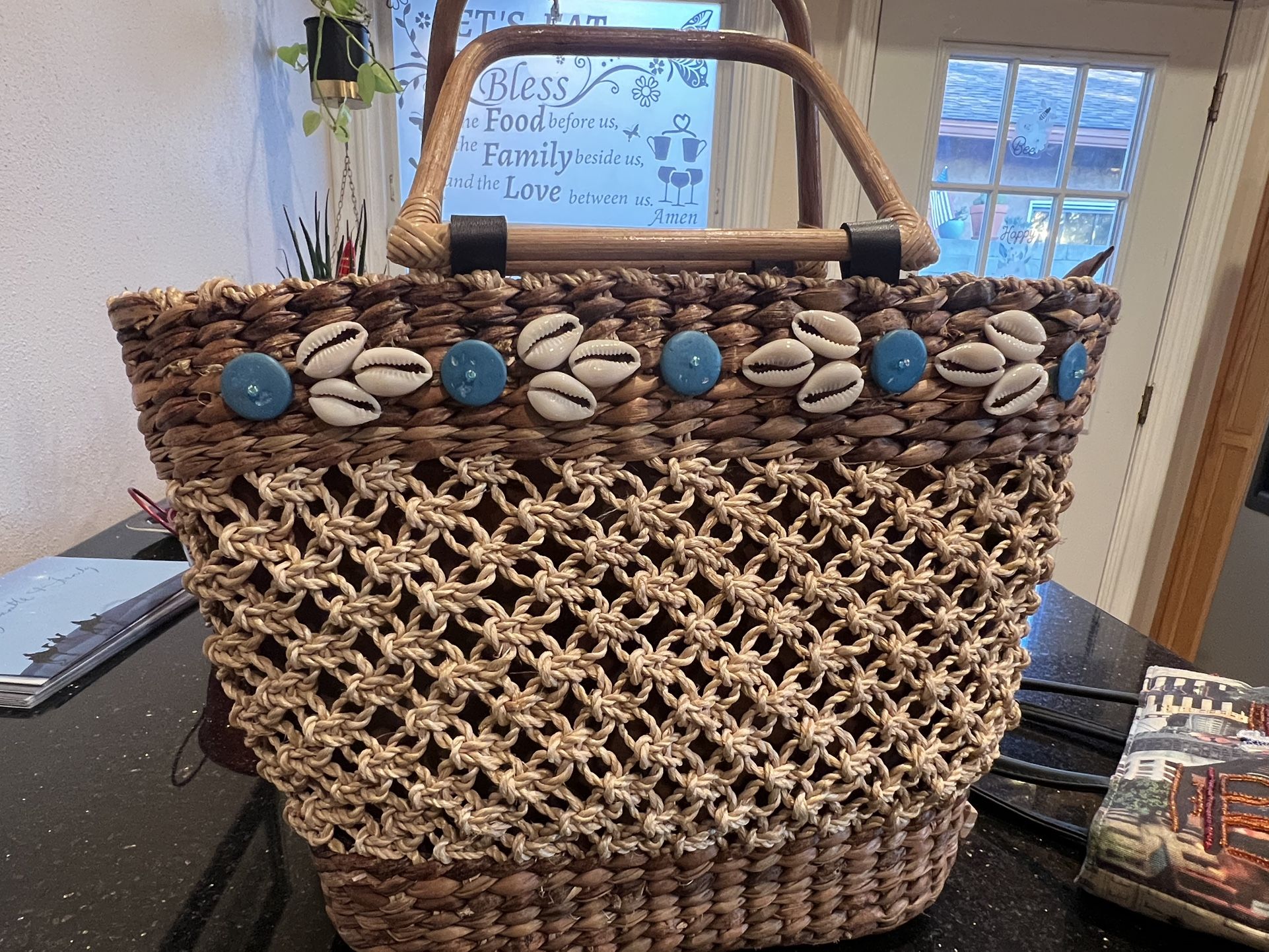 Nine West Straw Handbag Cowrie Shells & Turquoise ColorButton Accents 13x9”( pick up)