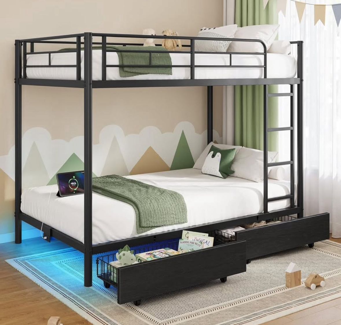 ✅ Brand new – never used or assembled ✅ Purchased from Amazon ✅ Still in original packaging MUST PICK UP: Bring two people to pick this up, I am NOT able to help lift this. It will be pick up from my front porch. Price $200 CASH ONLY This is a twin over twin metal bunk bed with built-in USB charging station, LED lights, and storage drawers. Plans changed and we no longer need it. ✨ Features: 🔌 Built-in charging station with 2 USB ports + 1 Type-C port 💡 RGB LED lighting with remote control • 20 color options • 21 dynamic lighting modes 🗄️ 2 large sliding storage drawers (great for clothes, toys, books) 🛡️ Full-length reinforced guardrails on top bunk 🪜 Fixed ladder with safety bubble pads 🧱 Strong, durable metal frame (SGS & ASTM F1427 certified) 🌱 Frame includes FSC-certified wood components ✅ No box spring required ✅ Easy assembly
