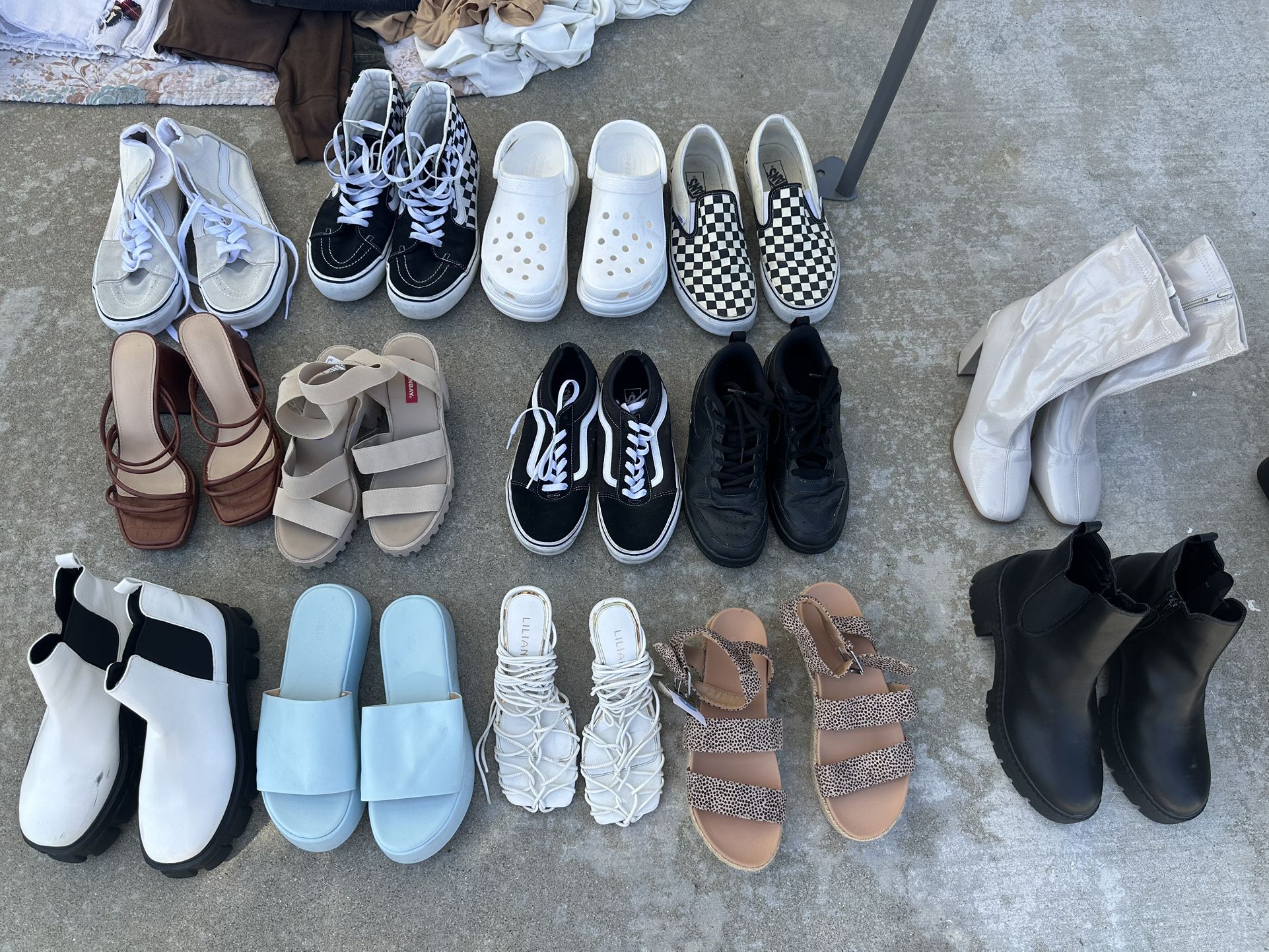 White high top vans size 10M $15 Checkered high top vans size 9M $15 Checkered low top vans size 10M $10 Black and white classic vans size 7.5W $15 White platform Crocs size 8W $35 Black Air Force size 8W $5 Black Madden Girl boots size 8.5W $15 Leapord Sandals size 7.5W $10 White strappy Heels size 7W $5 Light Blue platform sandals size 7W $5 White platform boots size 7W $10 Brown heels size 7W $10 Tan sandals size 6.5W $10 Tan heeled boots size 7W $15