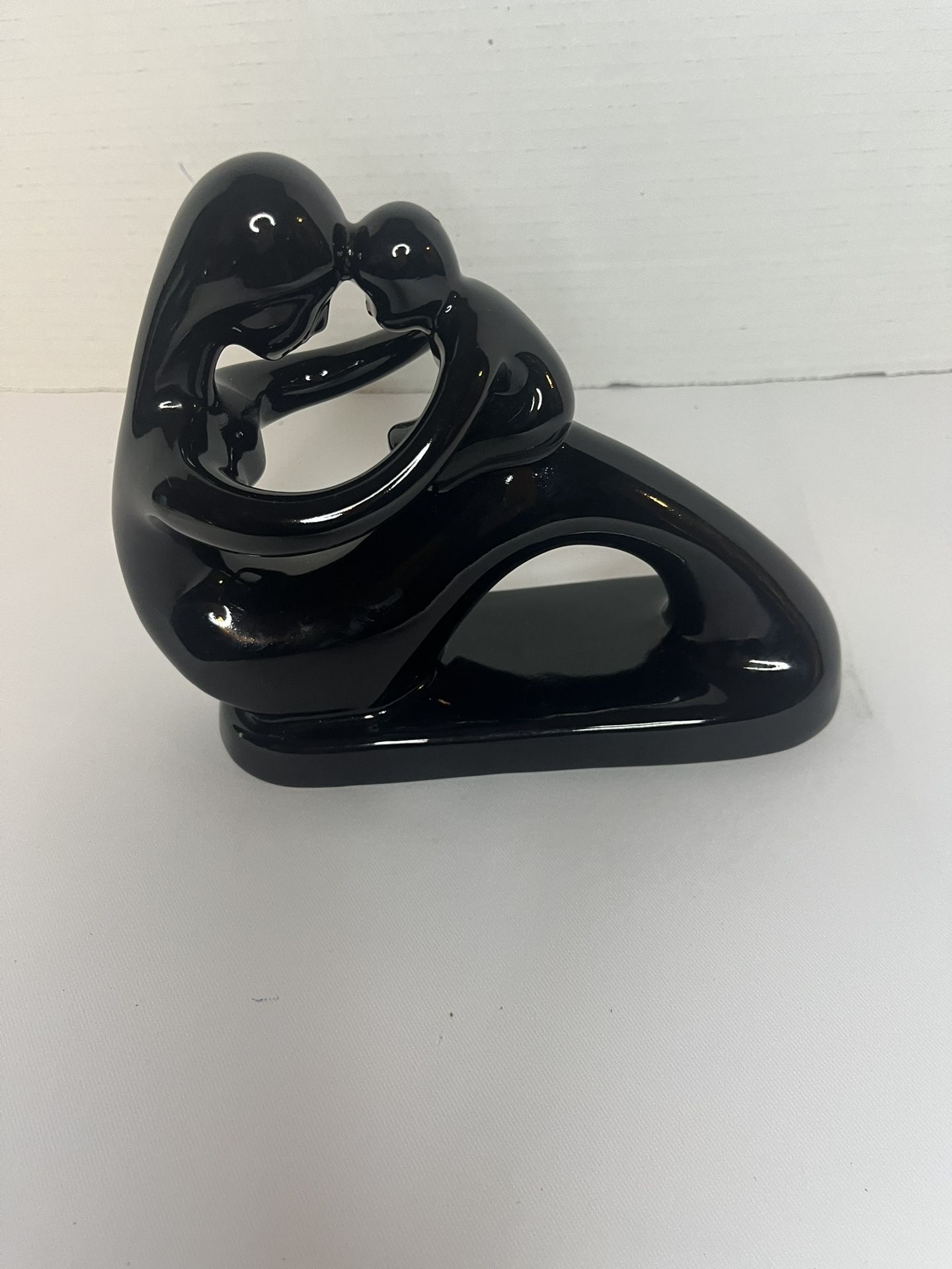 The "Mother and Child Love Figurine" is a beautiful black ceramic sculpture from 1990, standing at 7 inches in length and 6 inches in height. The abstract art piece features a mother and child motif, weighing about 2 lb. It is a glossy finished figurine made in Thailand, suitable for any room as a decorative item celebrating the bond between mother and child.