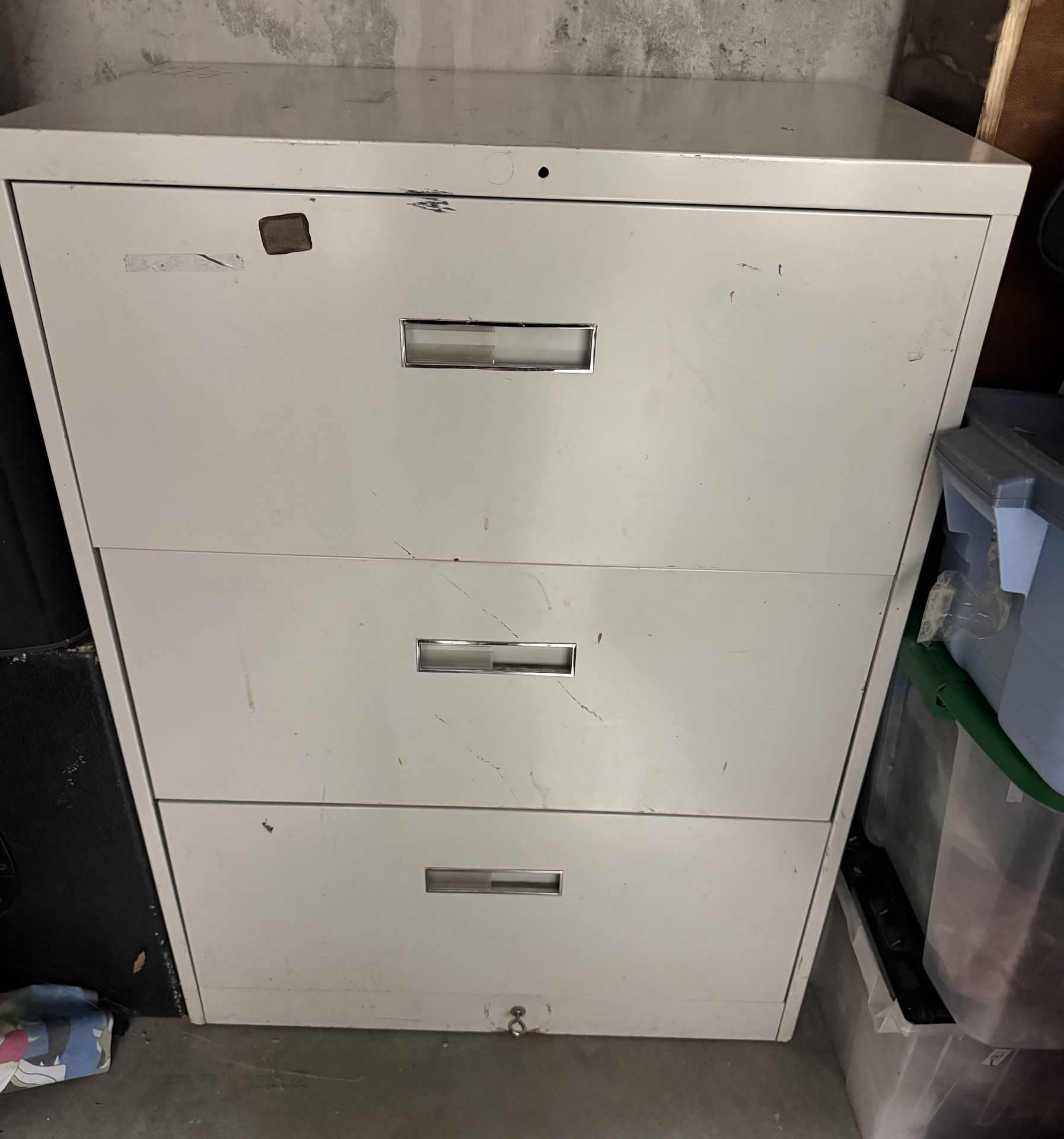 Sturdy metal filing cabinet. Has 3 drawers, good for organizing. Top drawer has rails for hanging files. Great for home office or garage. Has some scratches and marks from use.