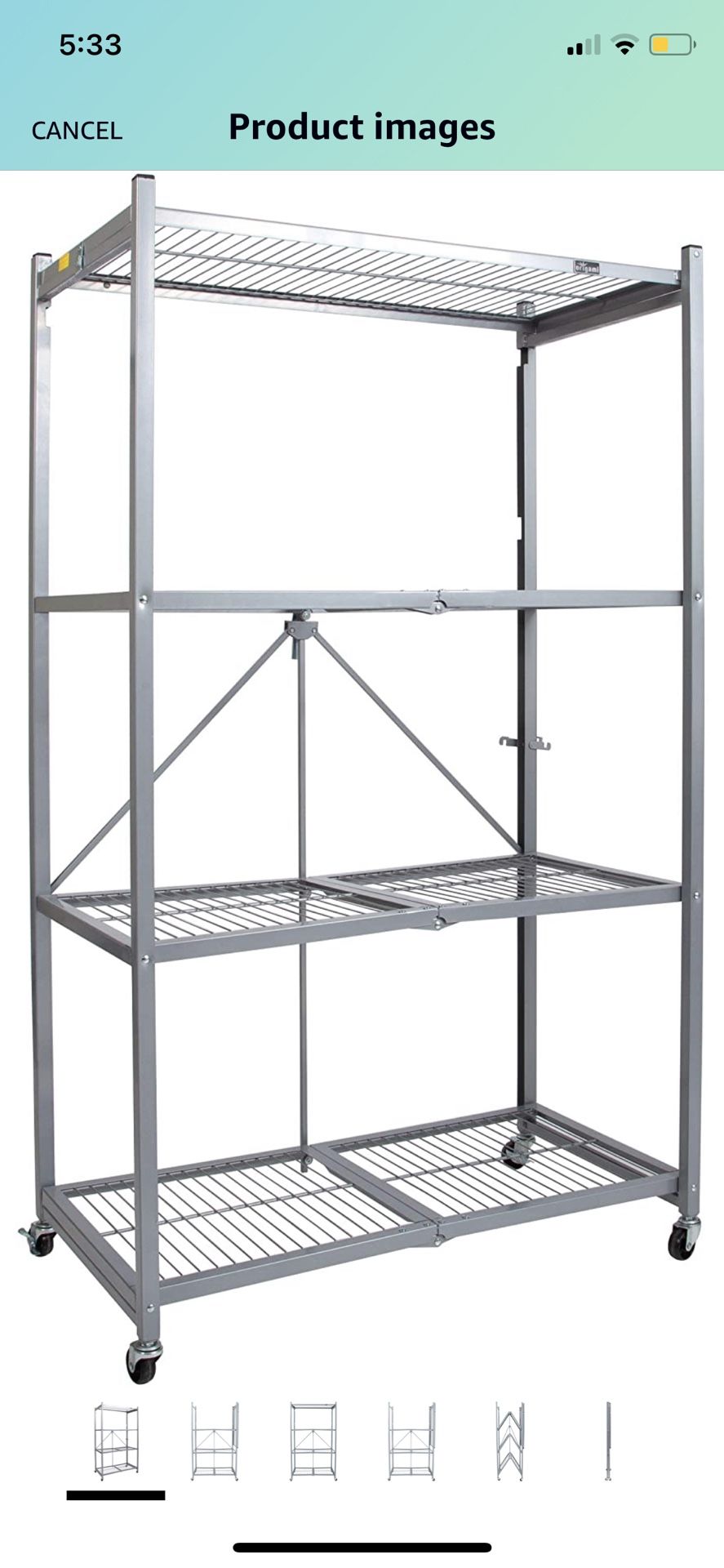 Item Weight: 41 lbs Unfolds in under 5 seconds Multi-Tiers for Storage Bins Uses: garage, bathroom, kitchen, closet, bedroom, ect. Comes with 4 caster attachable wheels Can hold up to 1000 lbs without wheels (250lbs/shelf) and 300 lbs with wheels (75lbs/shelf) Folds flat for easy storage, minimal space required Overall dimensions: 36”W x 21”D x 60”H Folded dimensions: 3.5”W x 21”D x 61.75”H