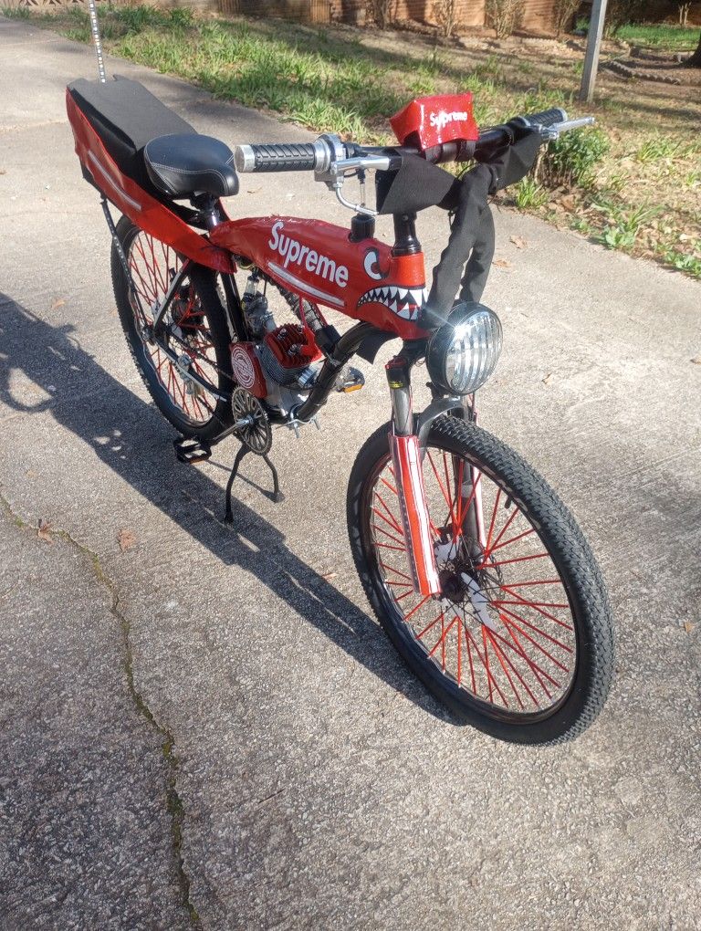 Motorized Bicycle 32:1 Gas x Oil Mix Ratio Bike with 2-Stroke Motor Brand NEW gas-tank-frame with Brand NEW Motor (not broken-in) Bicycle Engine gets 125mpg 2.5hp goes +35mph This push bicycle requires pedaling 5mph to start the motor. The 12v electrical system powers the alarm system, music activated LEDs, RGB whip light, and head light too! It has red LED rim lights, knight rider strobes, and Custom Supreme upholstery with the big red sparkle flakes in the waterproof vinyl. This bike is the only 1 made like this in the world, so make me an offer I can't refuse.