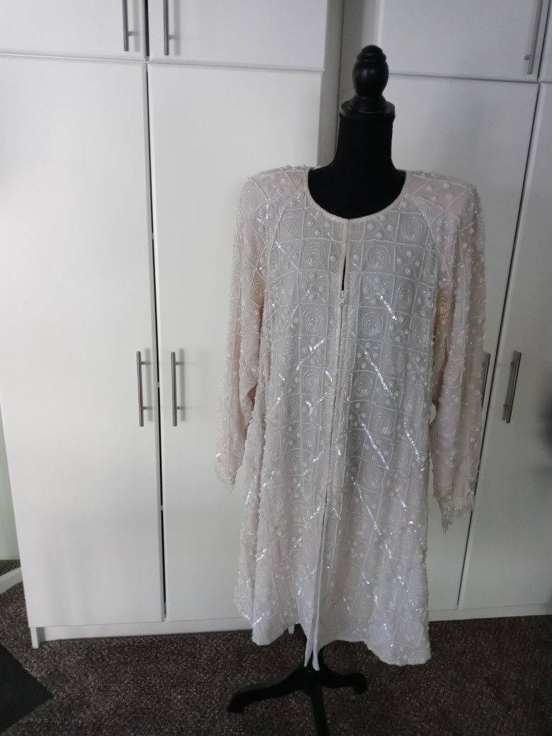 AS PICTURED DISCOLORATION DUE TO AGE Fully Beaded Blouse Clasp and Zip Closure Size 12-16 X-Large Bust 42-44 Inch Garment Length 38 Inch Sleeve Length 24 Inch Measurements Done While Garment Was On Flat Surface Accurately As Possible