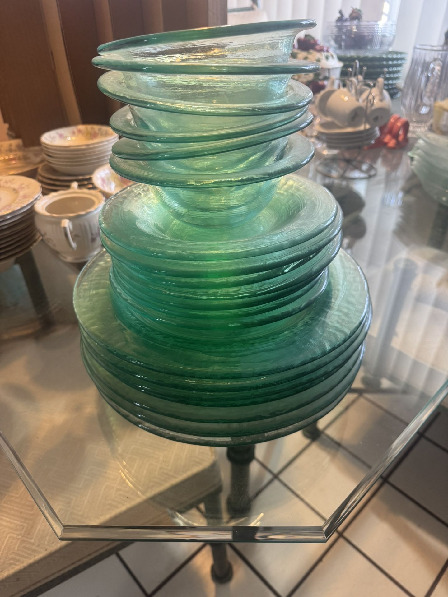 This is a matching hand blown Italian glass table were set produced in the Marano/Venetian region during the mid 20th century circa 1850s to 1970s each piece was individually formed by hand, resulting in subtle variations in thickness, texture, and shape a hallmark of authentic Italian glass making Set includes seven large dinner plates seven small plates six bowls. Details include hand, blown soda, lime, glass, soft, aqua, sea green tone, natural, light, catching texture, unsigned, typical of Italian export services, excellent condition no chips or cracks, ideal for Holiday, entertaining Italian style family, gatherings, or as a unique Christmas gift .