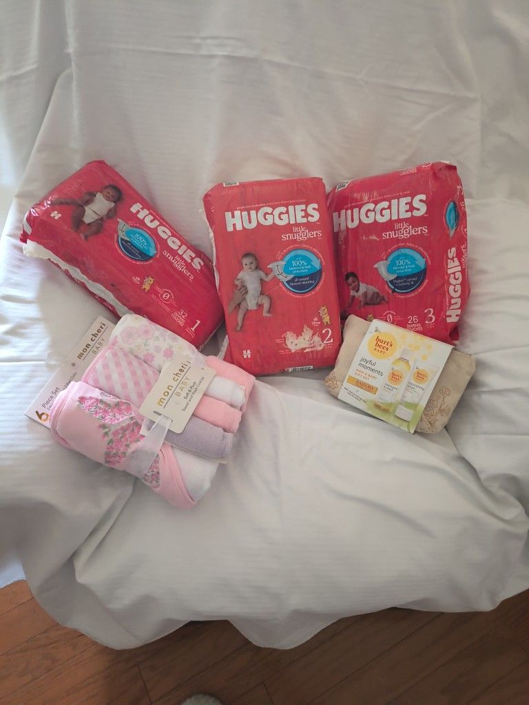 Huggies sz 1 and 2 and 3. Berts bees baby set and 6pc towel set.
