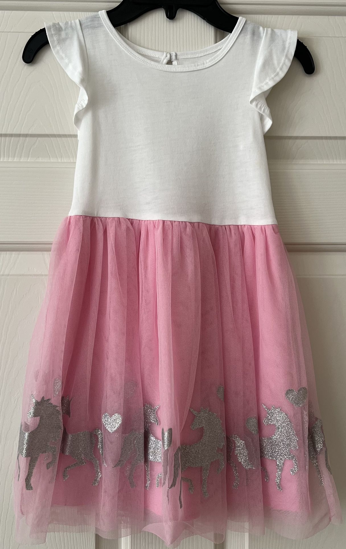 Wonder Nation Girls Casual Dress in size Small 6/6X. Color on top is white and the bottom is tule in the color pink with unicorn print in silver. There is a barely visible stain on the top part of the dress on the left side, see picture. Short sleeve with ruffle shoulder. In good condition.