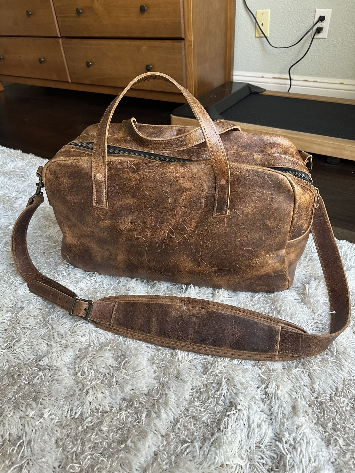 Brand new Loyal stricklin weekender duffle bag in horween leather. These are normally $900 but bought as part of a sample sale for $450 and cant return. Slightly bigger than i wanted. Brand new and never used. 20"L x 12"H x 8"D