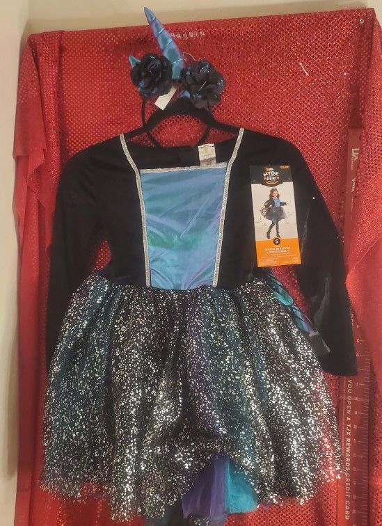 Mystic Winged Unicorn Costume. Kids size Small 6-7. New w/tags. Colors are black. Turquoise, purple and silver. Has beautiful wings with finger loops ready for "fly mode". Full costume with Dress and headpiece unicorn horn and roses. Please see all pictures as they are part of description. Pick up today. I'm in North Park San Diego area 92104. Asking $20, firm. Fun for holiday or everyday play. Makes a beautiful gift. Go check out my public profile to see all my items for sale. Follow me on OfferUp if you like my items.