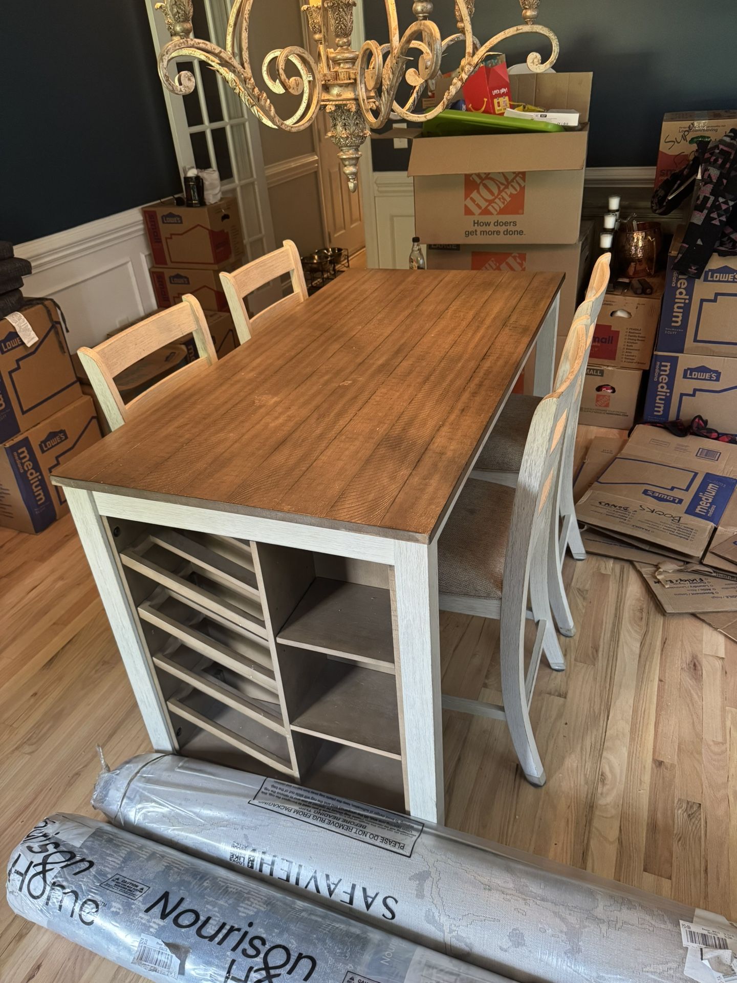 Used breakfast nook / small dining table and 4 matching padded chairs. Built in shelving and wine bottle storage. Purchased a couple years ago from Ashley furniture. Good shape. Recently moved and table doesn’t fit in our space. $200 OBO.