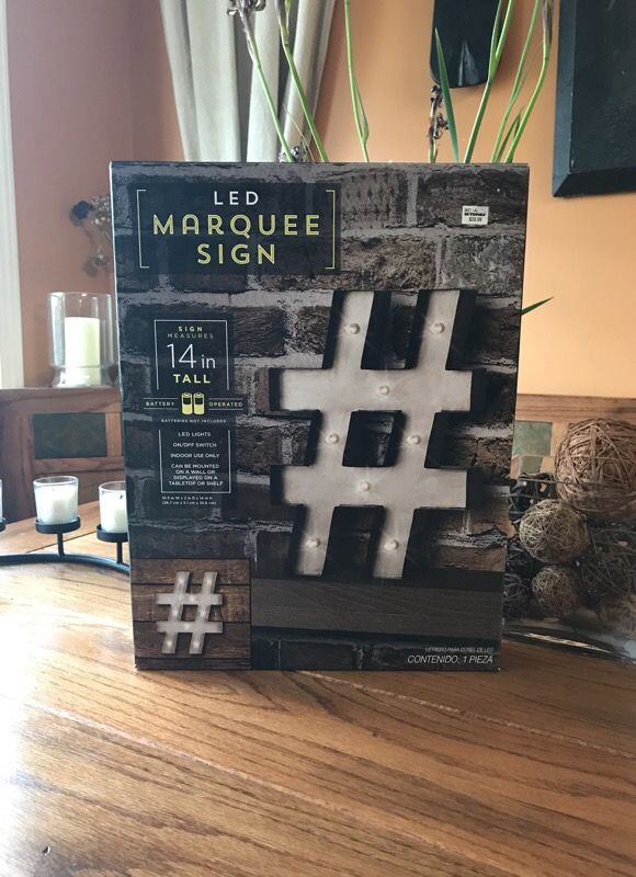 Brand new LED marquis # Sign from Bed Bath And Beyond-14 inches tall, battery operated, can be mounted on a wall or displayed on a tabletop or shelf. ( hard to find) I have (2 ) available! Originally 29.99, asking $15 each!