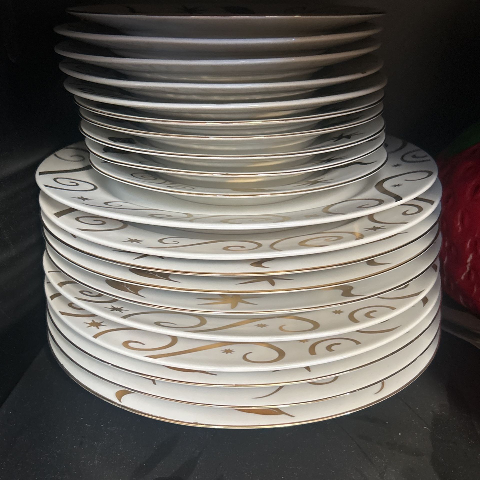 These plates make for a beautiful table setting, the gold designs are beautiful and great for holidays. Modern design, not your granny’s China set. Have the whole family, setting for 10 people. They are in perfect condition, used only once. First hundred dollars takes !
