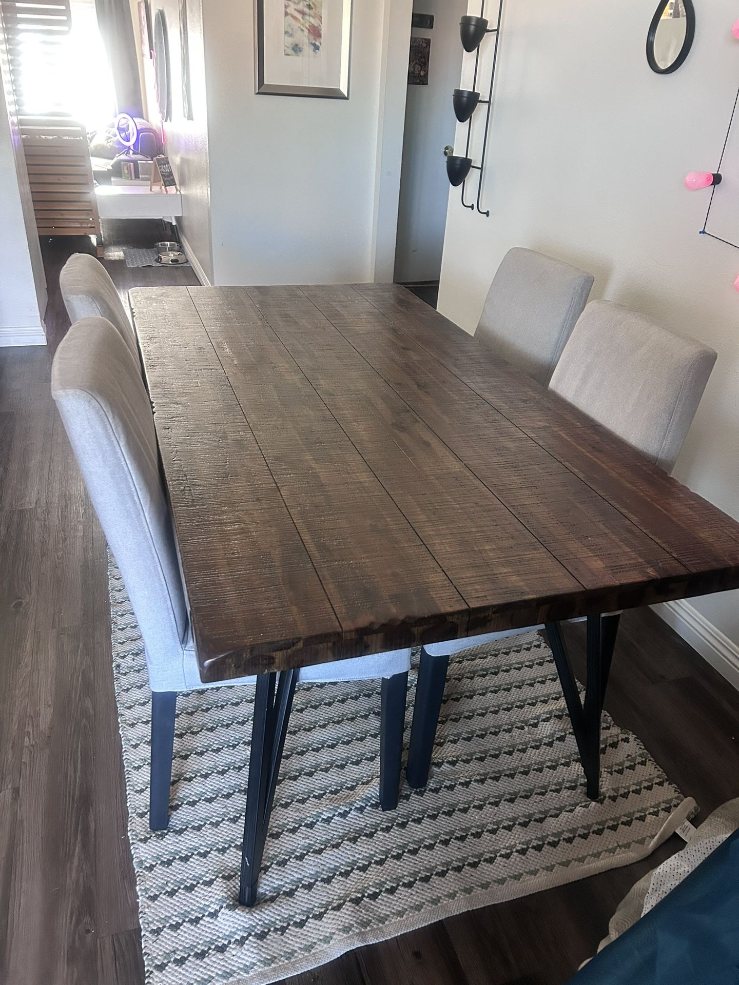 Upgrade your space with this stunning solid oak dining table paired with sleek iron legs—the perfect mix of rustic warmth and modern industrial style. This is a real wood table, heavy, solid, and built to last (not that flimsy stuff). ✨ Includes 4 elegant matching chairs ✨ Rich oak grain with serious character ✨ Strong iron legs = rock-solid stability ✨ Seats family, friends, and dinner parties with ease This set makes a statement the moment you walk in. Perfect for a dining room, loft, or anyone who loves quality furniture without paying showroom prices. 💥 $250 for the full set — table + 4 chairs Honestly, this price is a steal. First come, first served.