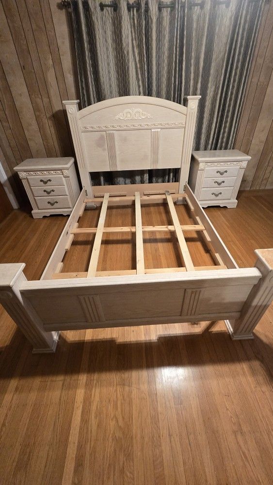 Queen bed. Headboard, footboard, frame Dresser; 6 drawers and mirror Nitestand. 2 with 2 drawers each In excellent shape except one foot leg needs painting. One legside post has little paint peeled
